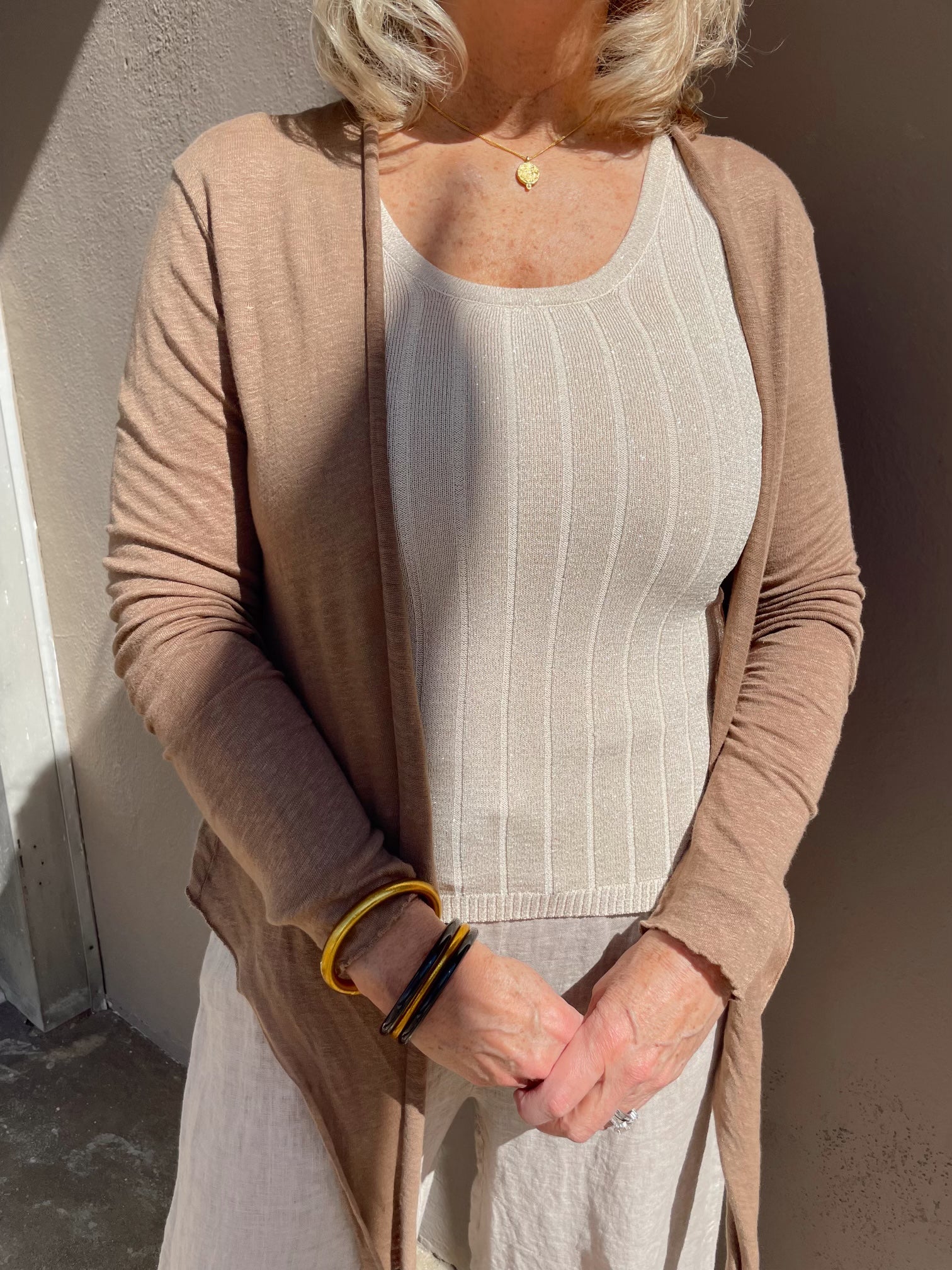 The perfect fit tank with gold or silver metallic flakes.