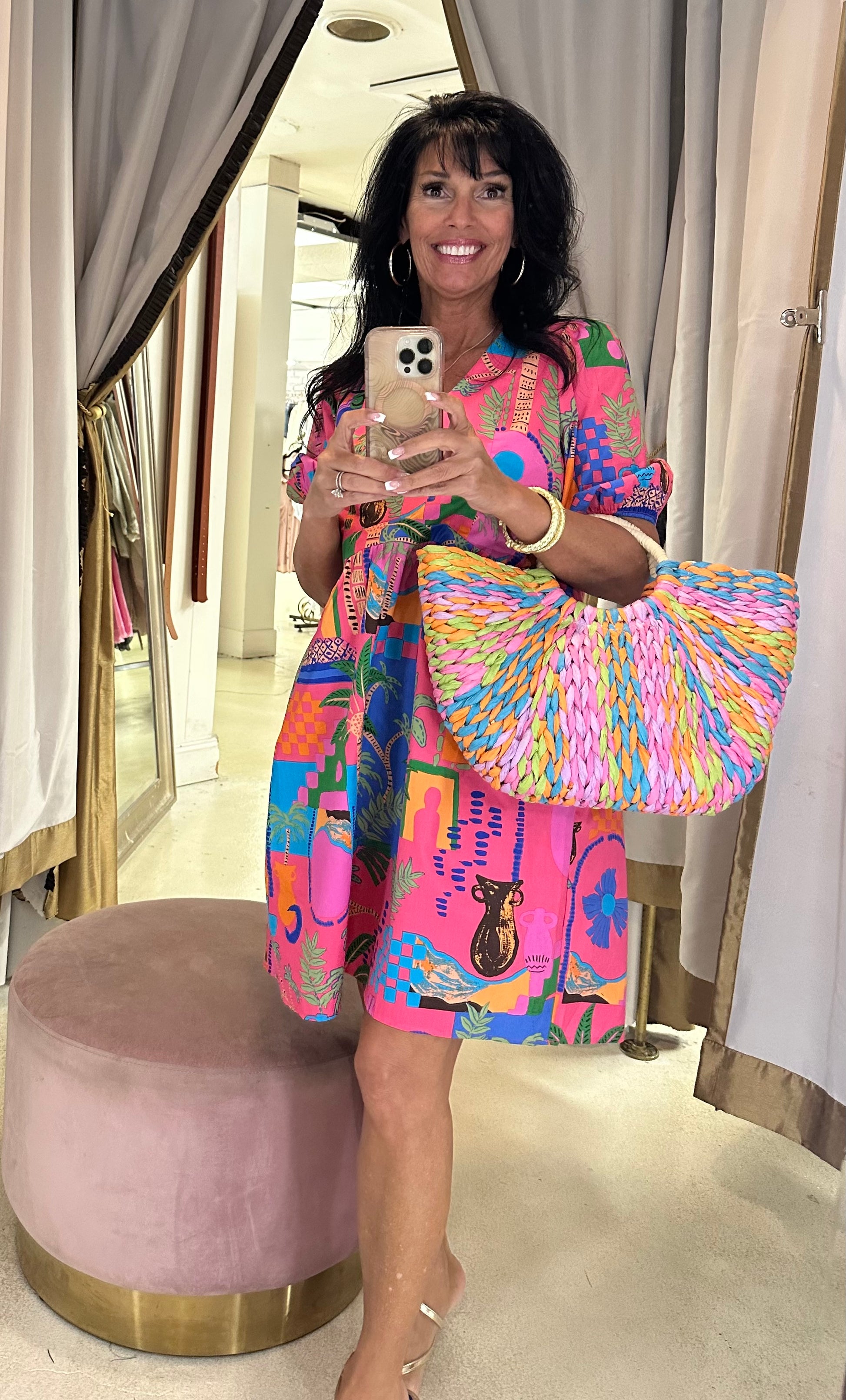 Turn heads without saying a word. This fun multi print decorates this shift mini dress with short puff sleeves, v-neckline and a high and low effect. Pockets on each side are very convenient. Pink or blue heels match perfectly.