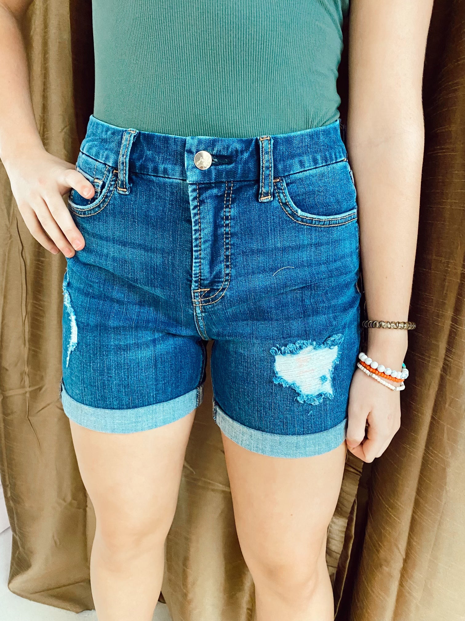 Mid Rise Stretch Distressed Cuffed Shorts