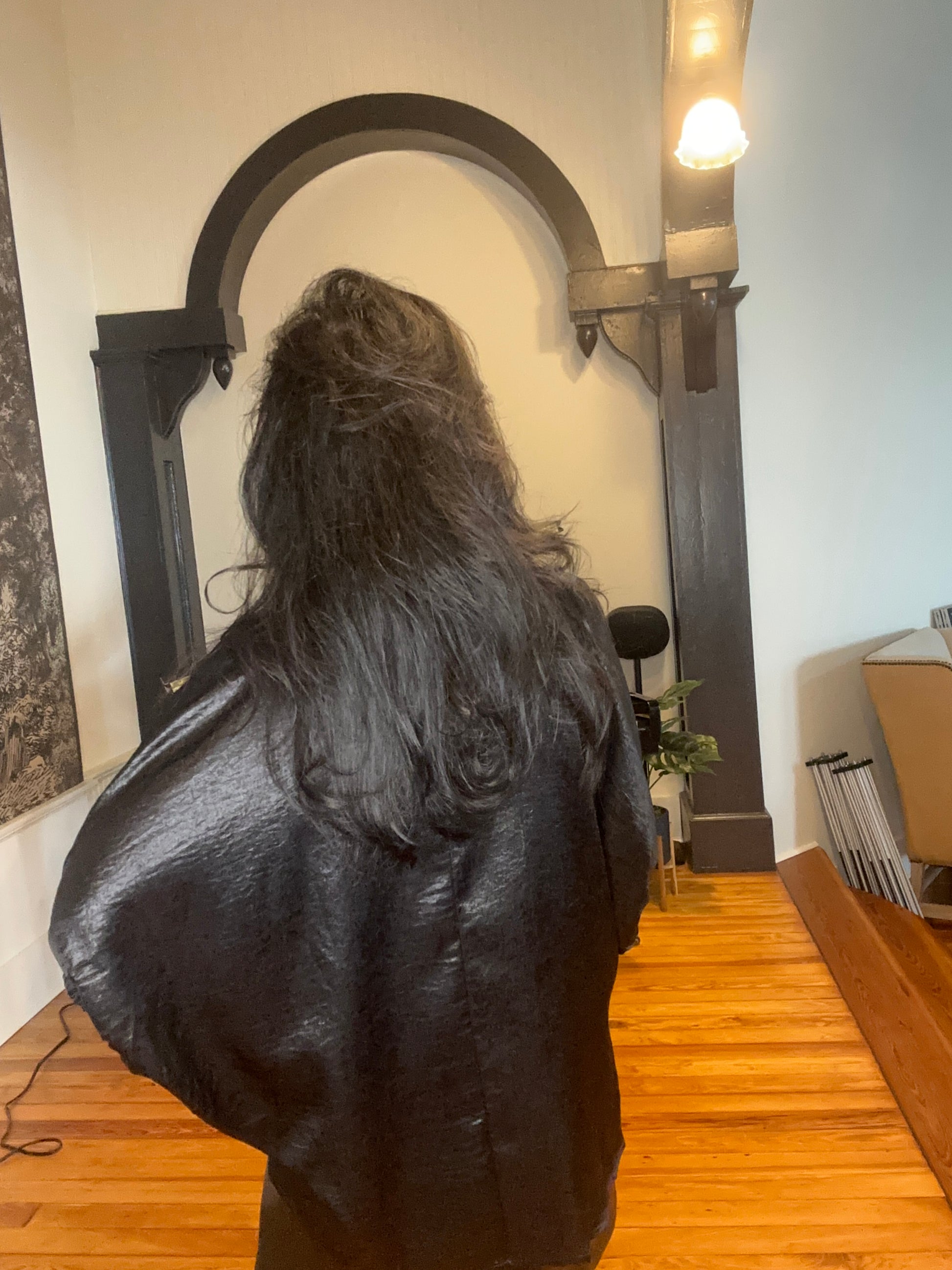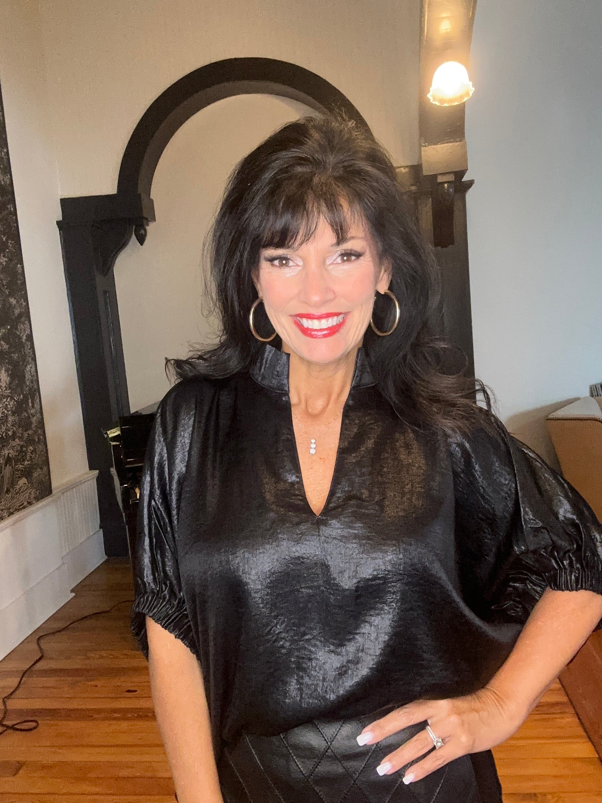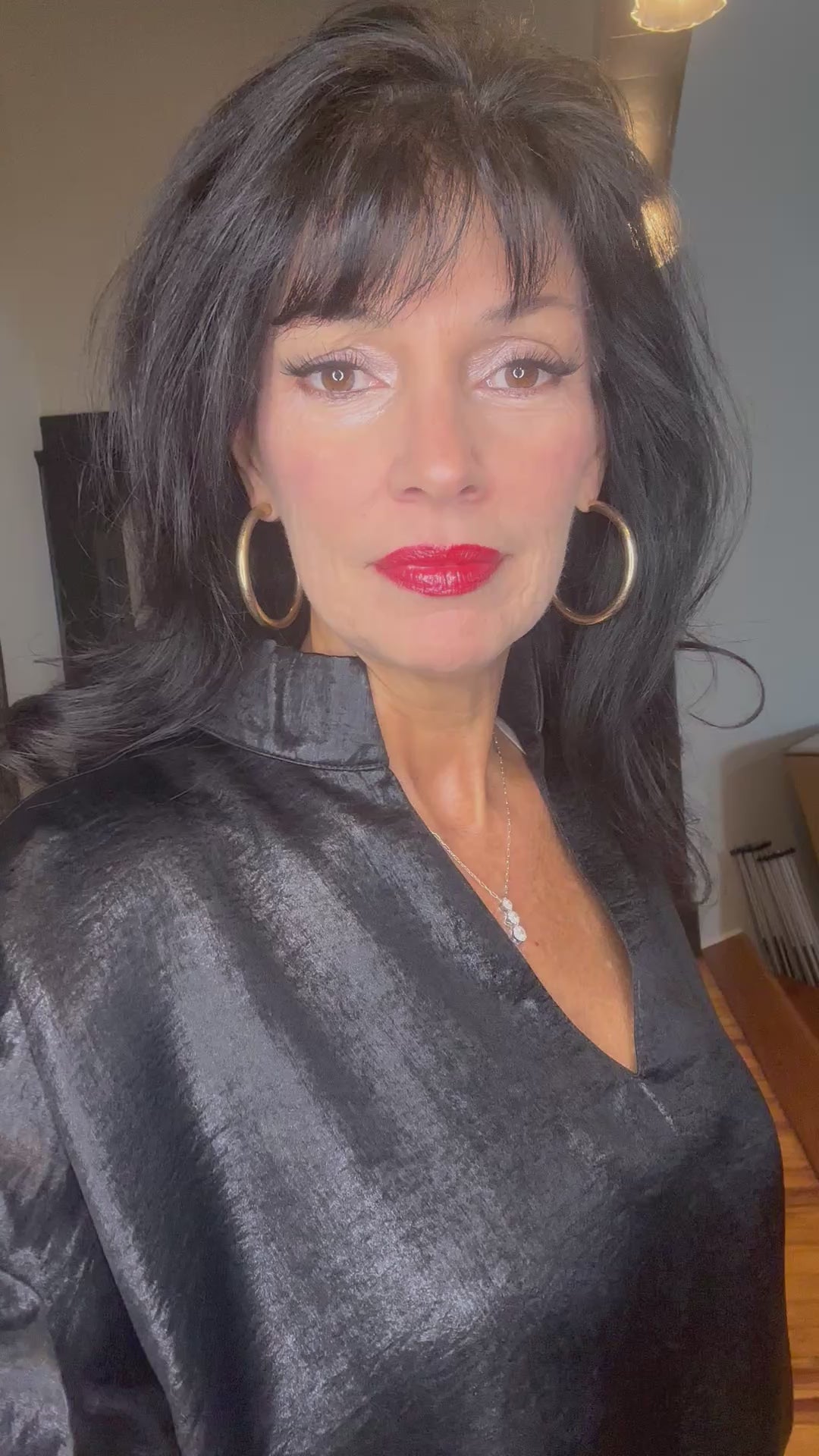 The top is a chic, black blouse crafted from a silky, lustrous fabric that catches the light beautifully. It features a relaxed, oversized fit with a stylish V-neckline. The short sleeves have gathered detailing, adding a touch of elegance and volume. The overall design is both sophisticated and versatile, making it suitable for a variety of occasions, from casual outings to more formal events. This top can easily be dressed up or down, making it a staple piece for any wardrobe.