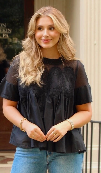 The Midnight Muse Top is an elegant blend of romance and edge. Featuring intricate lace paneling, sheer mesh at the neckline, and structured pleating through the body, this beauty brings serious statement energy to your wardrobe. Perfect for pairing with denim, trousers, or layered under a blazer for a night-out look that speaks volumes.