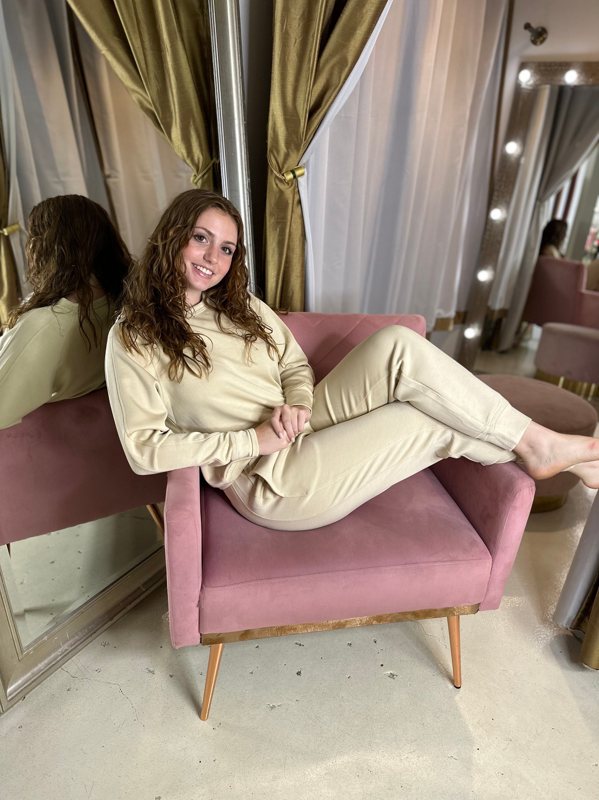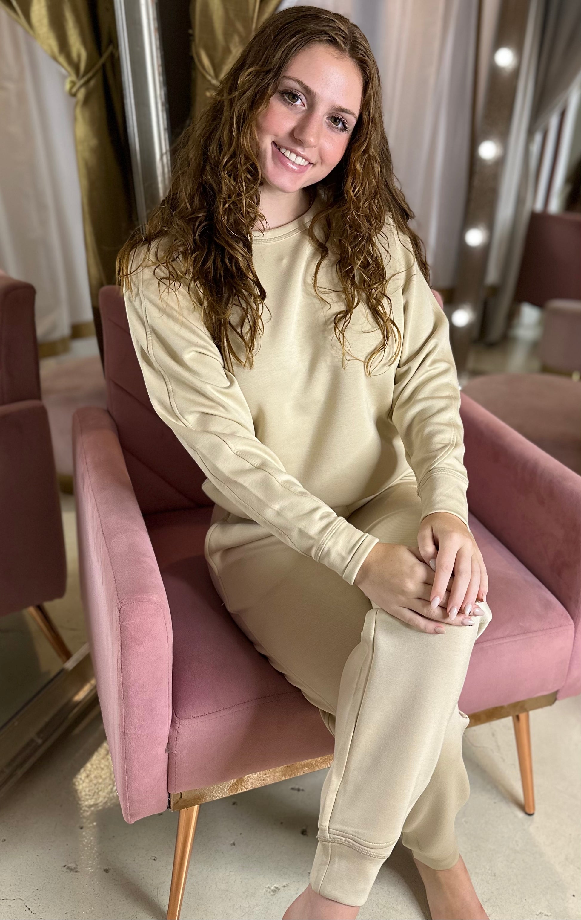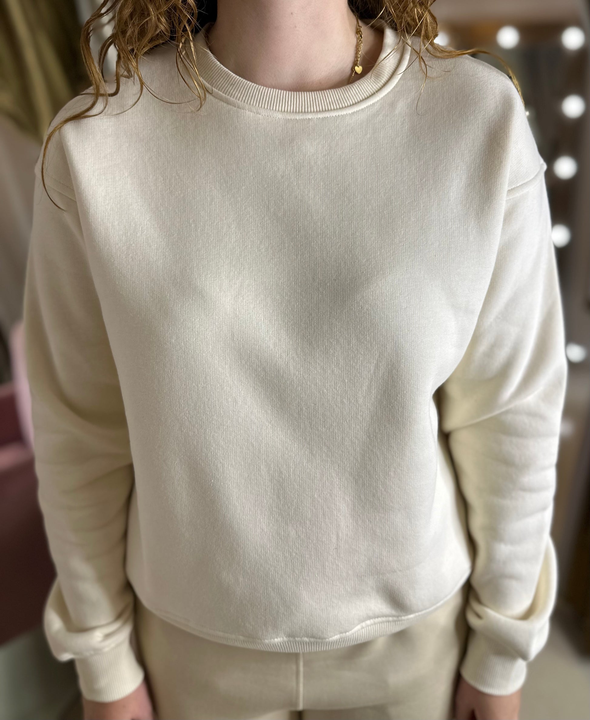 So soft and cozy sweatshirt in a natural color . Has a round neck and long sleeve. The bottom is banded.