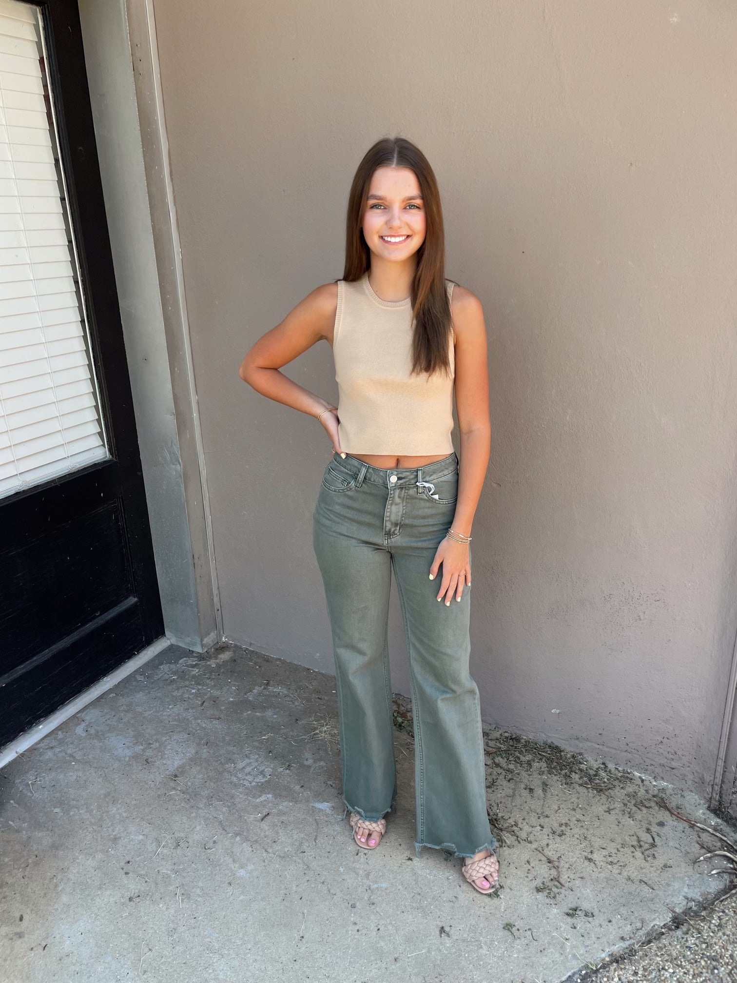 These are a lean vintage flare with in a great army green. Has a raw hem and is 100% Cotton