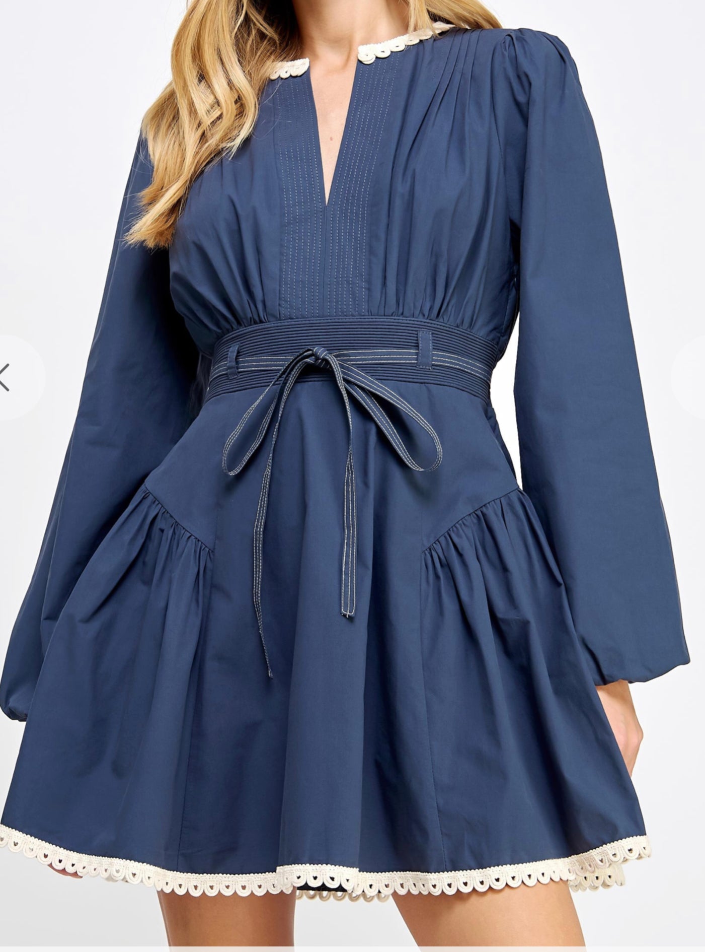 Lace trim detail mini dress in poplin fabric. This style features a top stitched split packet V neckline, long sleeve with elasticated cuff, shirred mini skirt, a removable top stitch waist tie, cinched banded waist with stretch smock at back, shirred shoulder, lining, and scallop lace trim at hem/neckline.