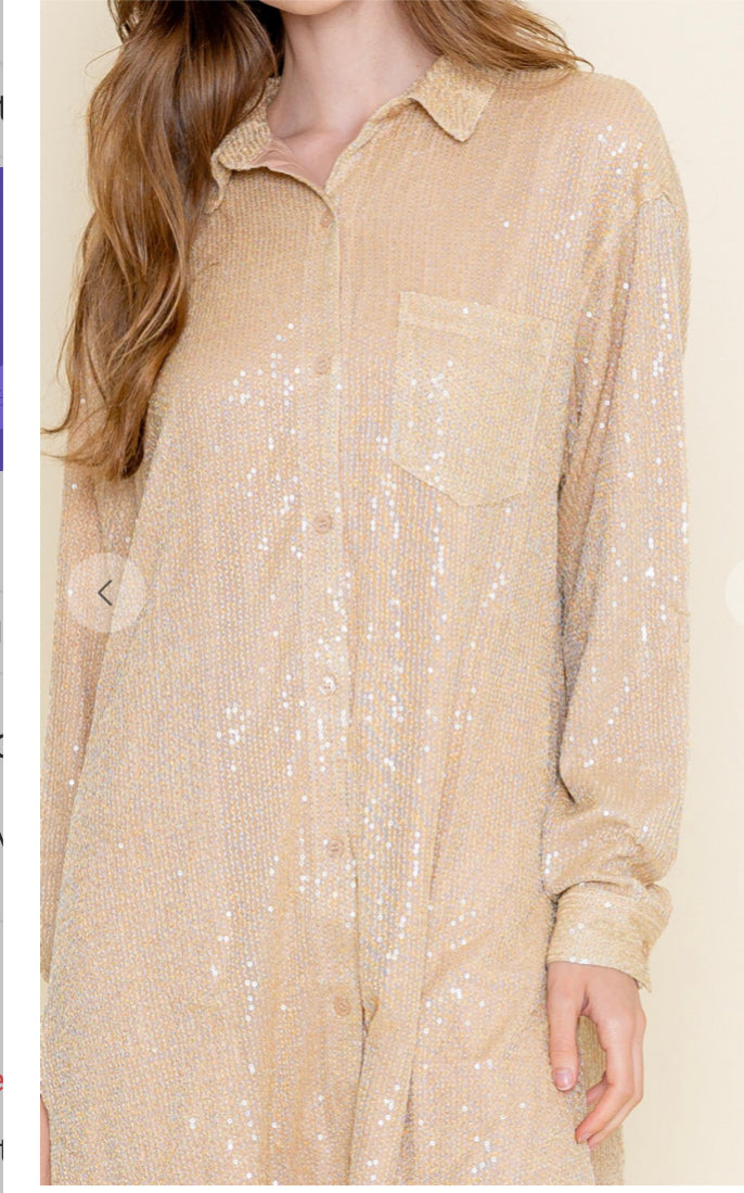 This is a great sequin shirt dress. It buttons up the front in this beautiful neautral taupe. Can be worn as a tunic or a dress.