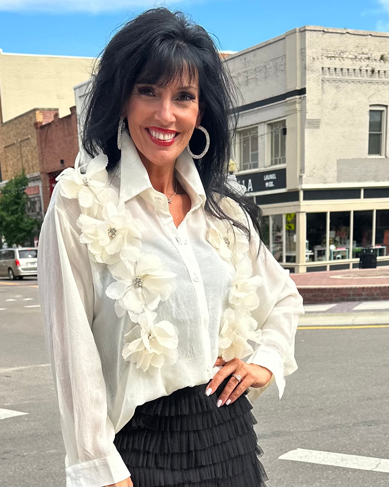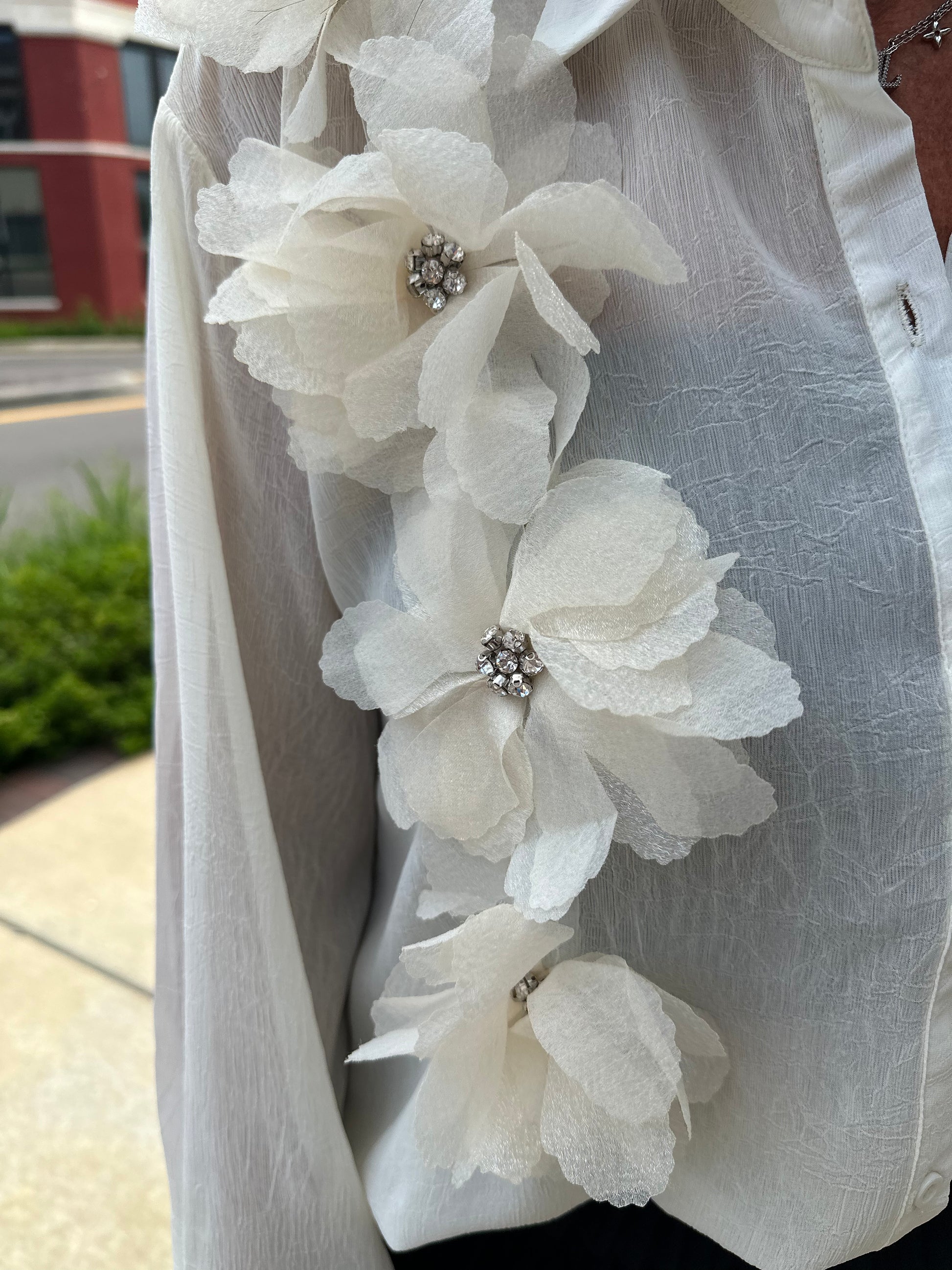 Romantic, ethereal, and ready to turn heads—this sheer ivory blouse is a floral fantasy come to life. Crafted with delicate fabric and adorned with 3D shimmer petal appliqués and rhinestone-studded centers, it’s the definition of elevated elegance. The tailored collar and button-down front give it just the right amount of structure, making it perfect for everything from weddings and showers to stylish brunches and special events.