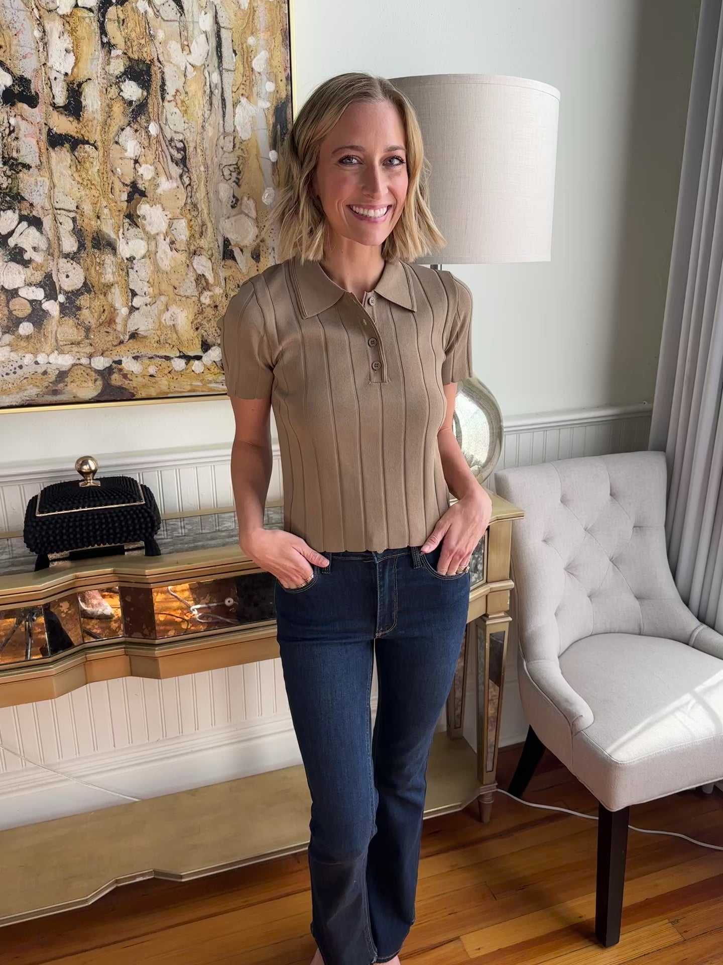 These tops are the most versatile pieces you can own. I want one in every color. The material is a great mix of Viscose and Nylon. The sit just right at the waist and have a ribbed texture. They have a cute collar and 3 buttons in front.