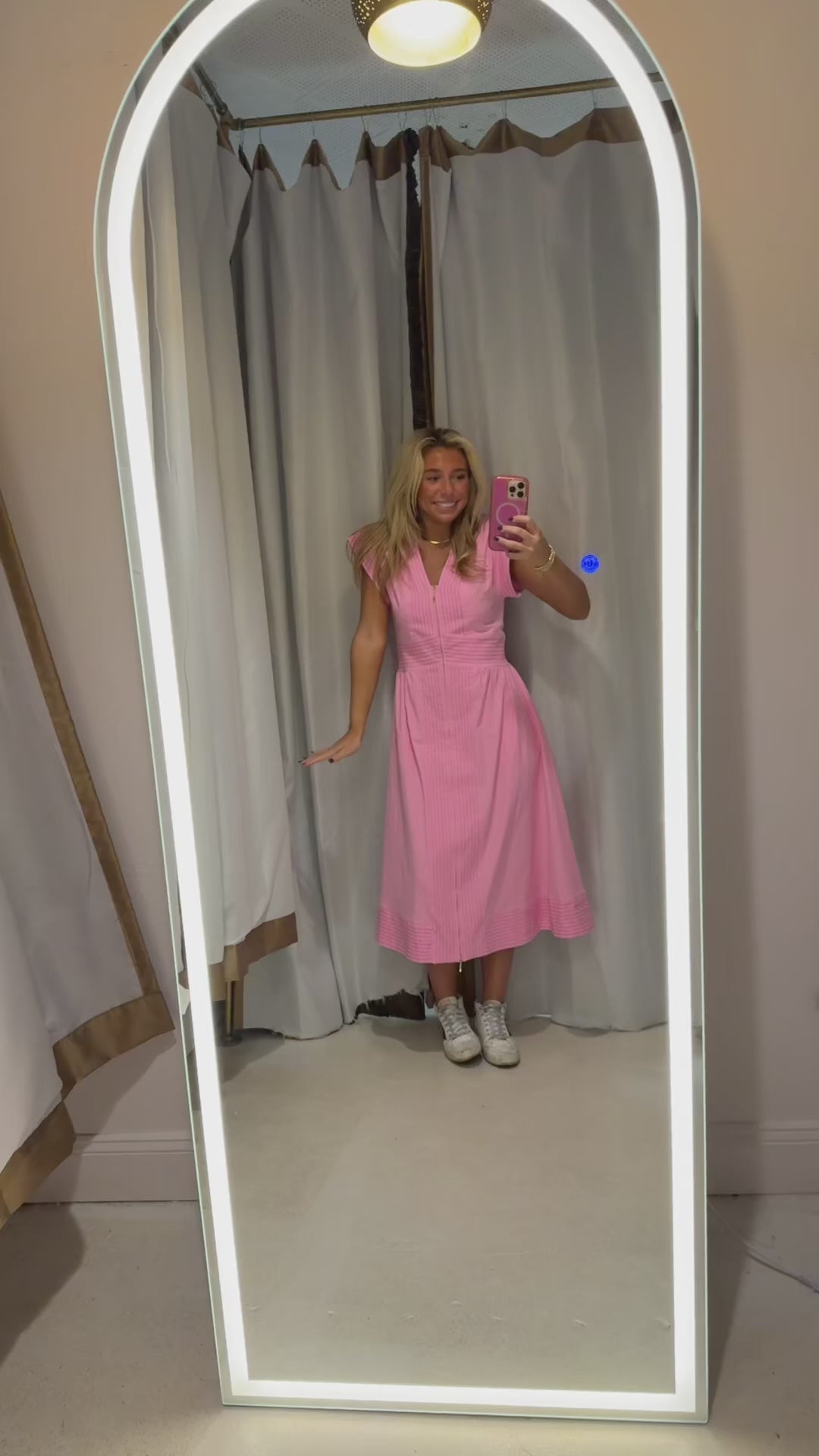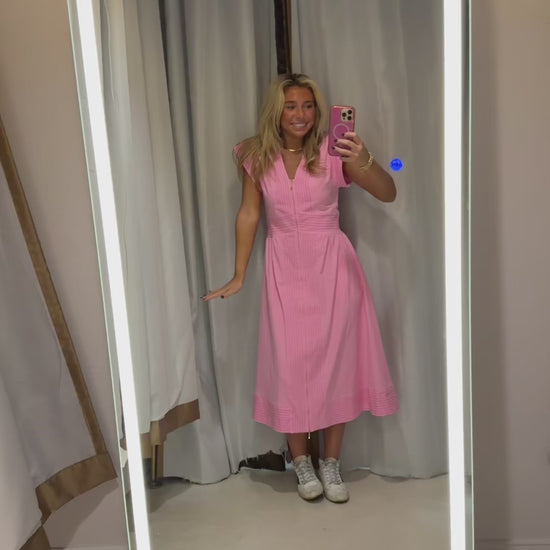 This elegant pink midi dress is the perfect blend of feminine charm and everyday sophistication. Designed with a flattering V-neckline, subtle pintuck detailing, and a functional front zipper, it creates a beautifully tailored look while remaining comfortable and easy to wear. The softly defined waist flows into a relaxed skirt, offering movement and grace with every step. Crafted in a lightweight fabric, this dress is ideal for brunch dates, showers, church, or any occasion where you want to feel effortlessly put together.