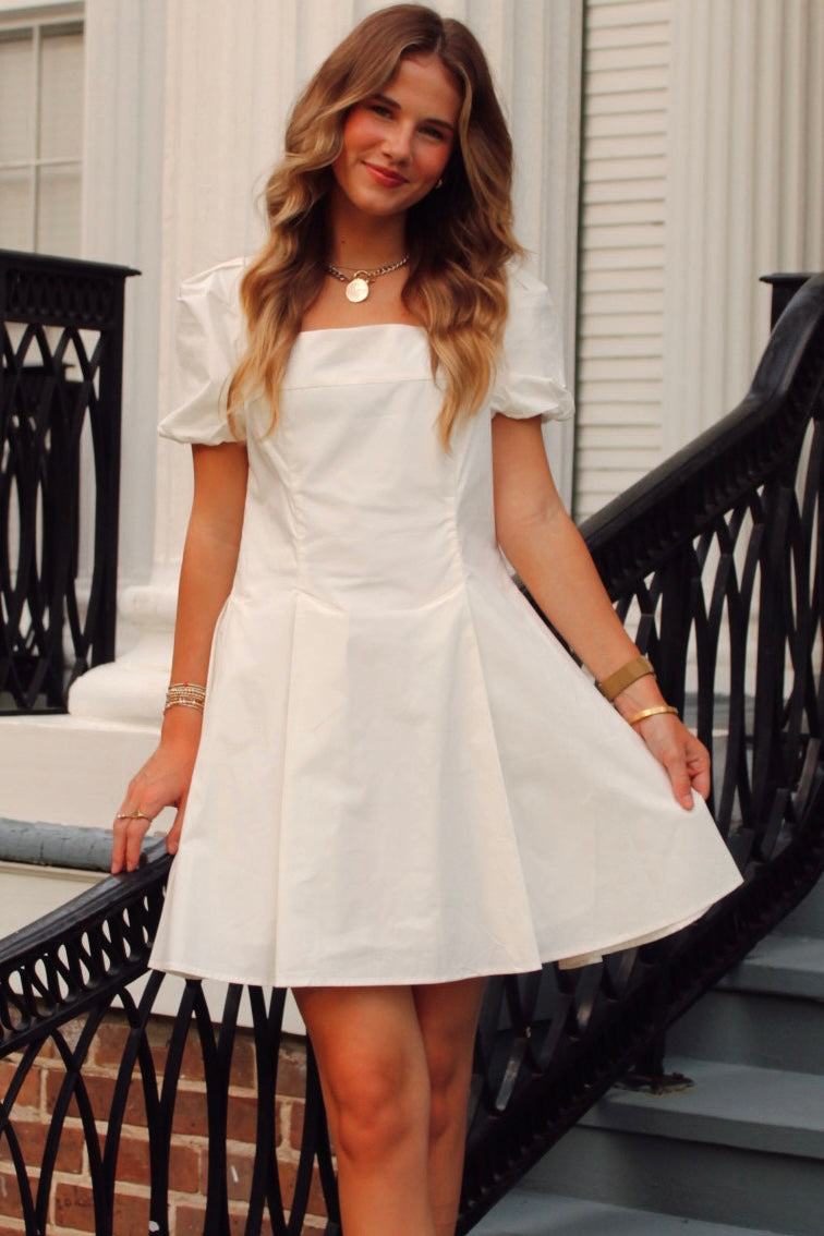 Soft, sweet, and effortlessly chic — This Dress is made for twirling through sunny days and starry nights. Featuring a flattering square neckline, dreamy puff sleeves, and a tailored waist, this crisp white beauty is a timeless favorite for brunches, bridal events, or just feeling pretty on a Tuesday.