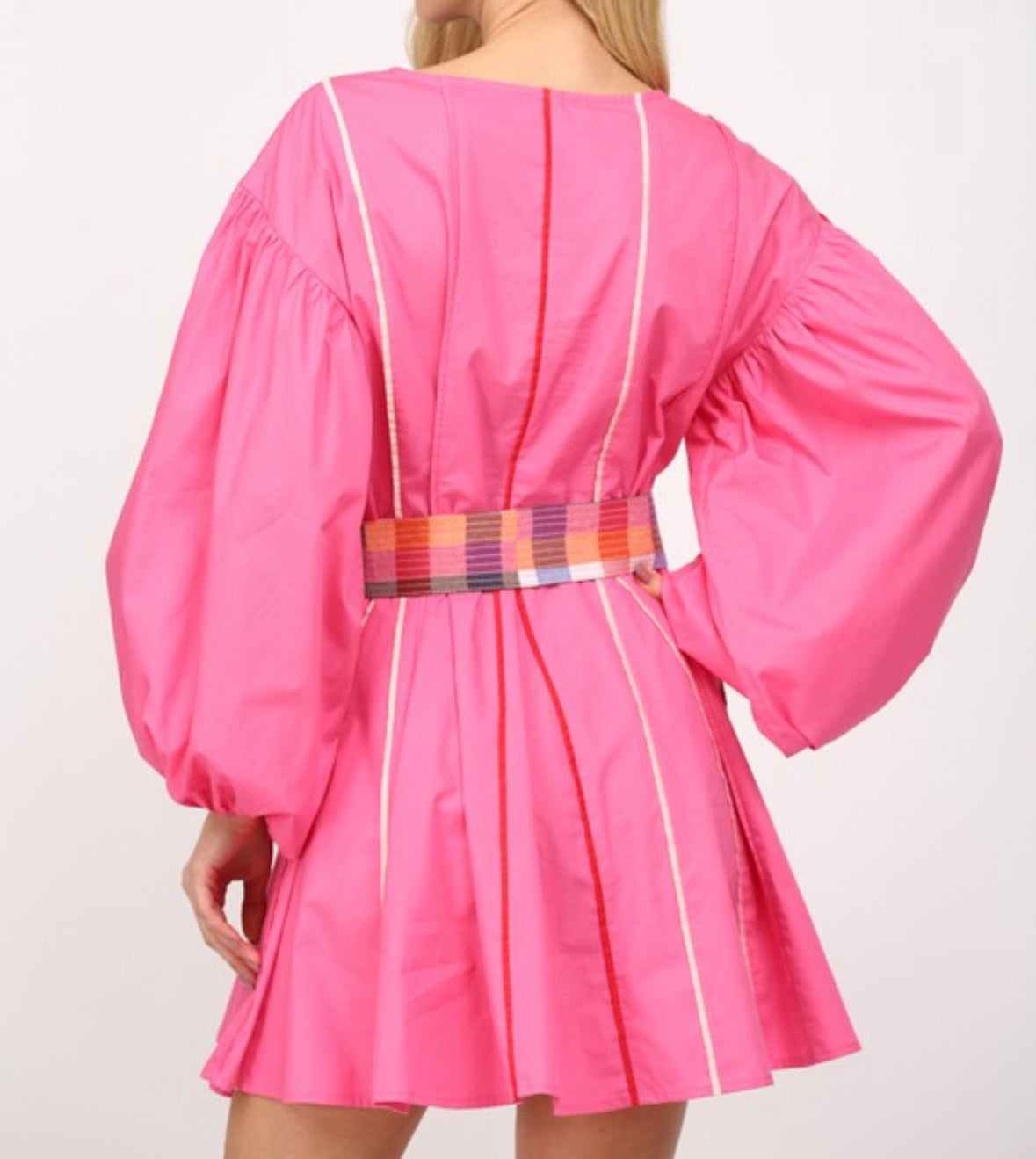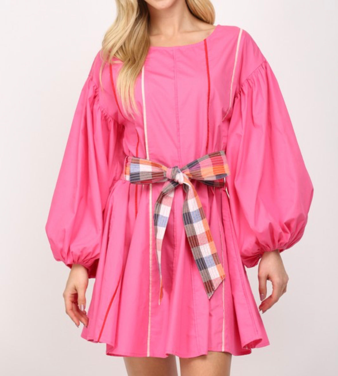This is a fun and fabulous color dress. The tie is bright plaid . It has a long puffy sleeve and has piping down the front with a flare bottom.