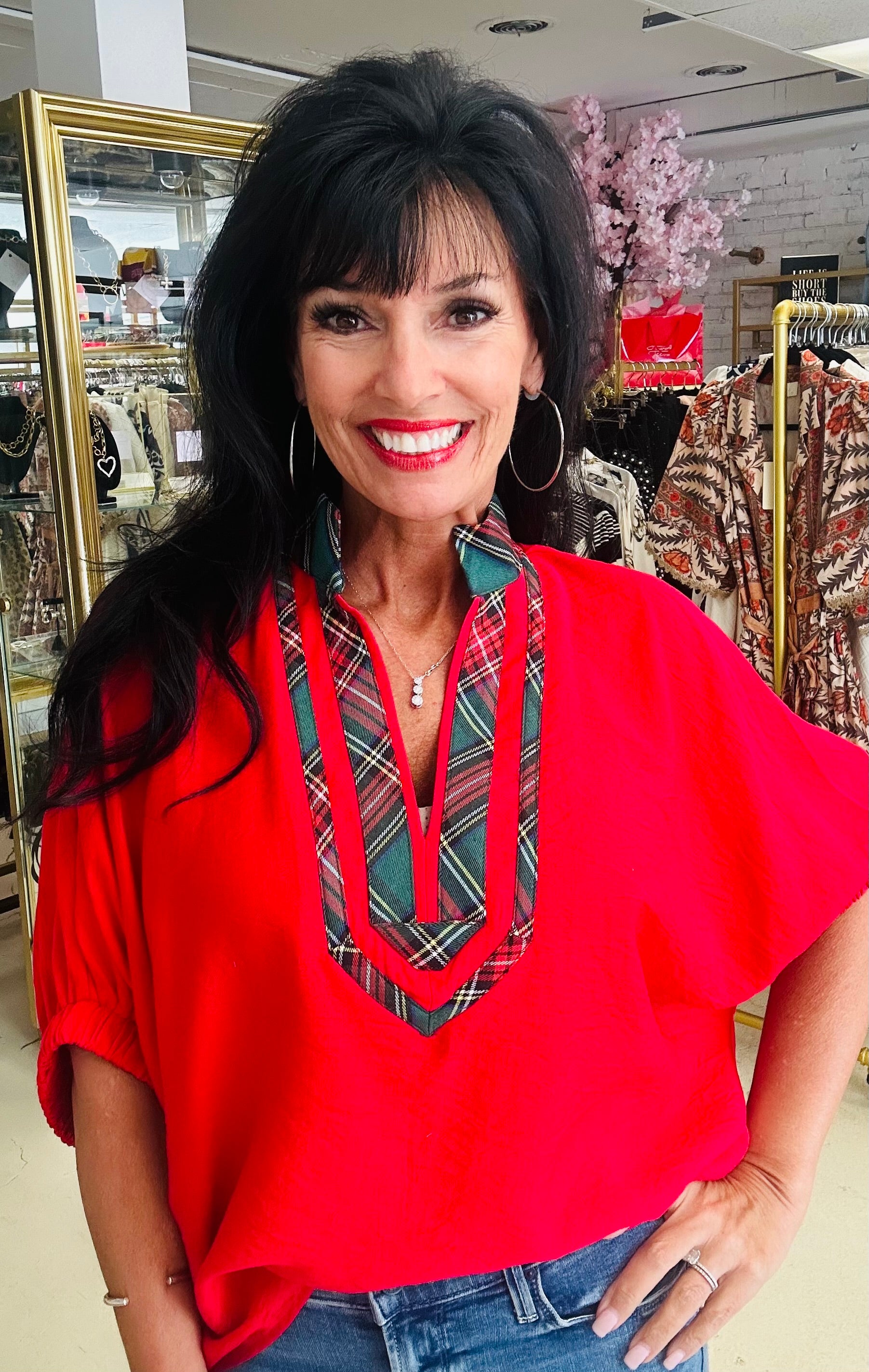 This top features a bold red hue that radiates warmth and cheer. The standout plaid neckline adds a fun contrast, making it perfect for a festive look. The relaxed fit and flowing sleeves provide comfort while maintaining a stylish silhouette.