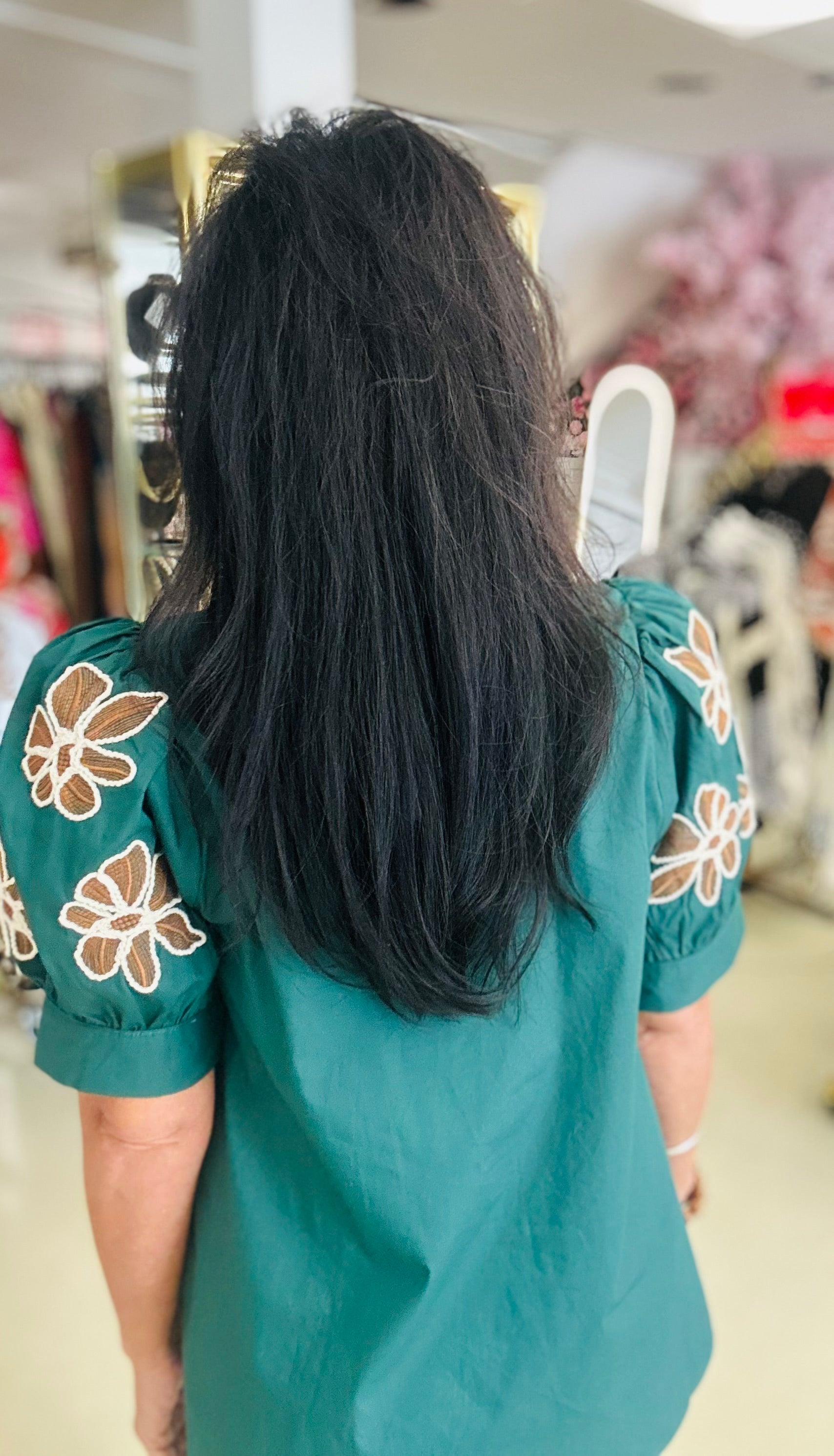 This hunter green color that exudes sophistication, complemented by charming puff sleeves adorned with floral embroidery. The v-neckline adds a touch of elegance, and the subtle ruffles along the neckline enhance its playful appeal.