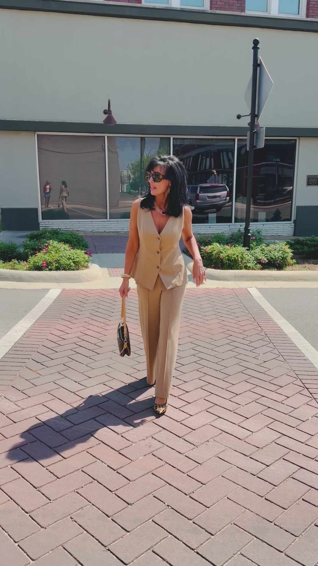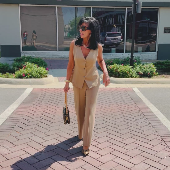 The structured fabric drapes beautifully, while the clean lines and neutral camel tone make them endlessly versatile. Pair them with the matching Power Play Vest (sold separately) for a chic, coordinated set, or style them with a simple tee or blouse for an elevated everyday outfit.
