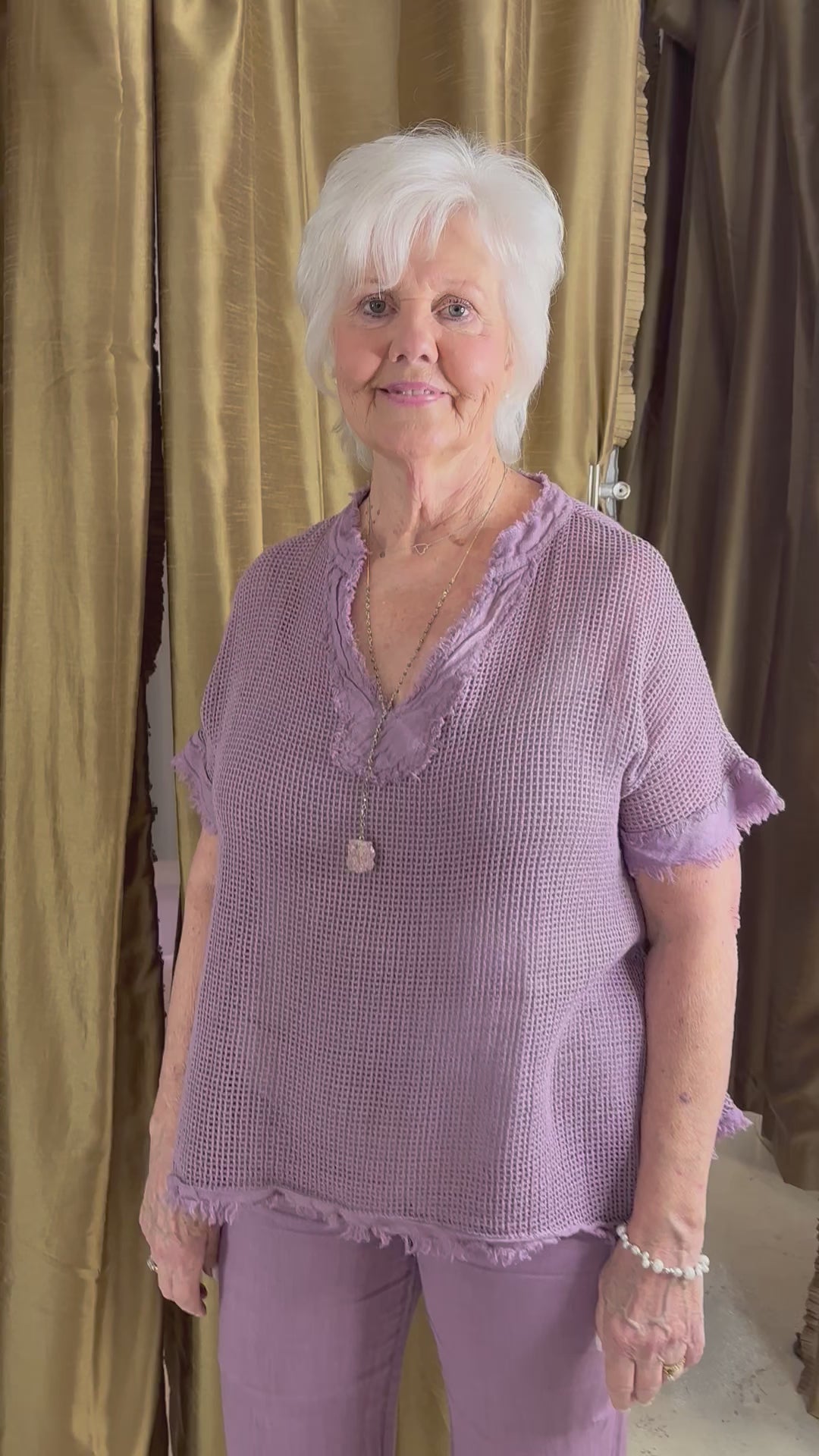 This is a favorite of everyone. The color is Fabulous and different for your summer look. It’s a net like top with a matching cami underneath. It’s short sleeve with frayed hem.