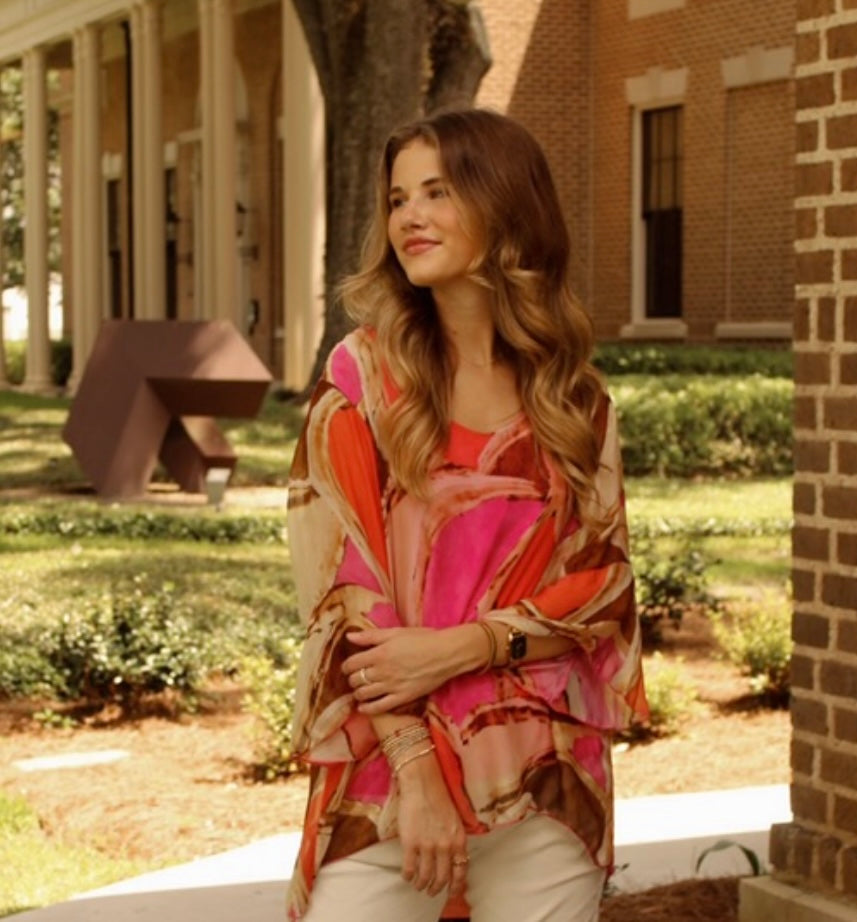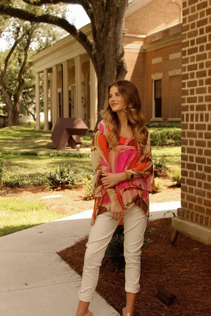 Crafted from lightweight, luxurious silk, this top drapes like a dream and offers an airy, ethereal feel. Its flowy silhouette and subtle sheen give it a timeless, sophisticated vibe that transitions from day to night with ease. The bright bold print makes it the perfect to add a pop of color for a fun & relaxed look.