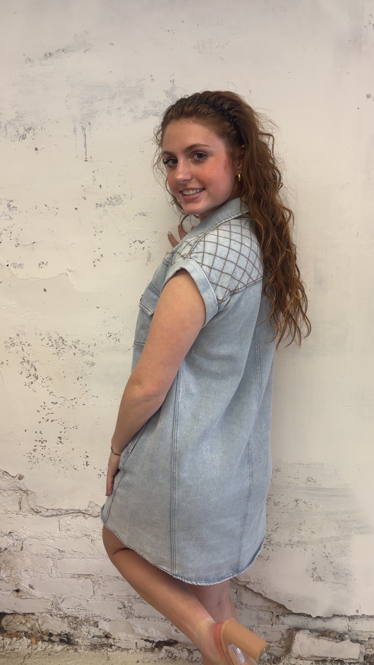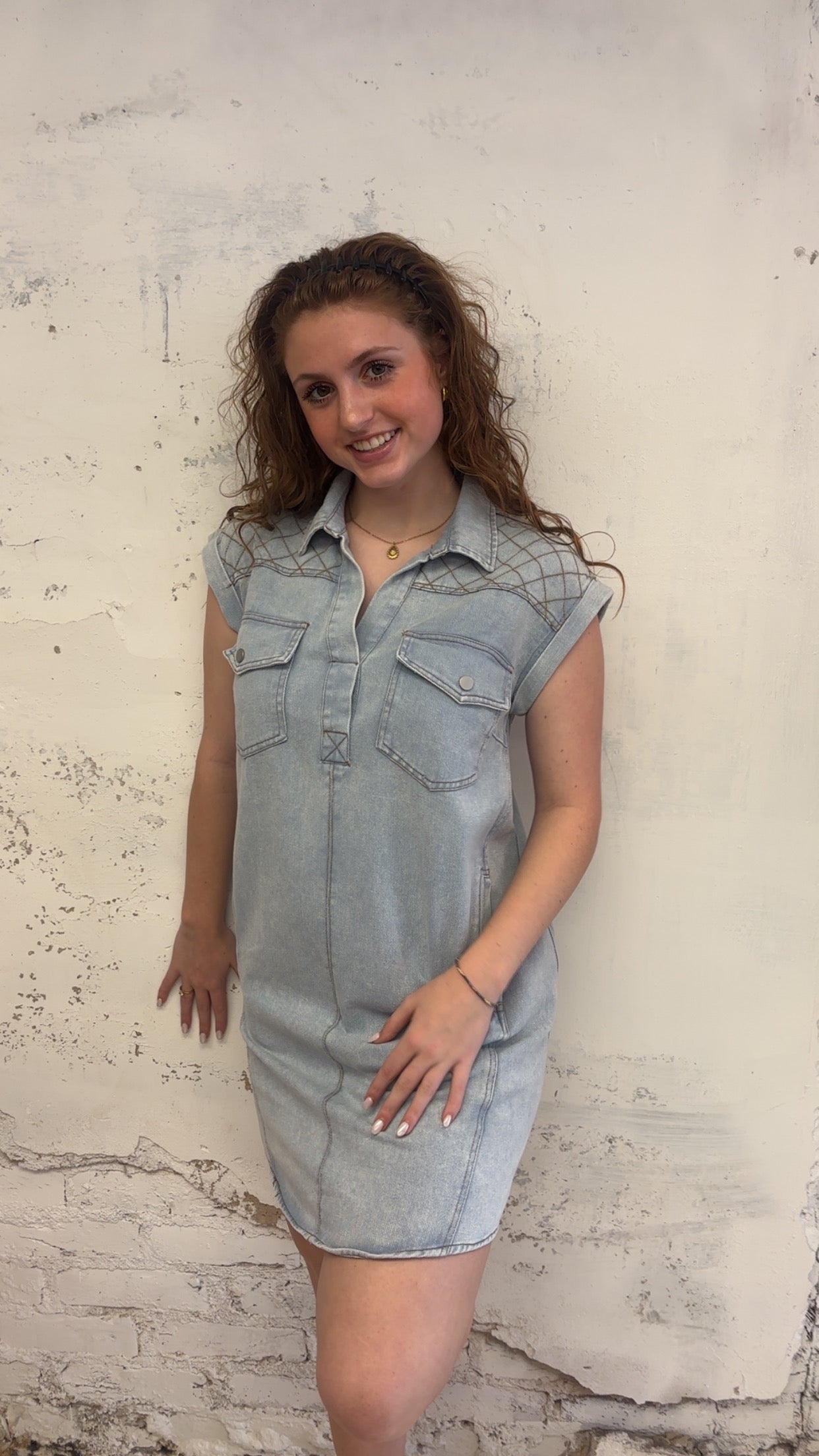 This dress is sooo cute with its quilted pattern across the shoulders. It has cute pockets up top and usable pockets at the hips. It’s a very appropriate length also.