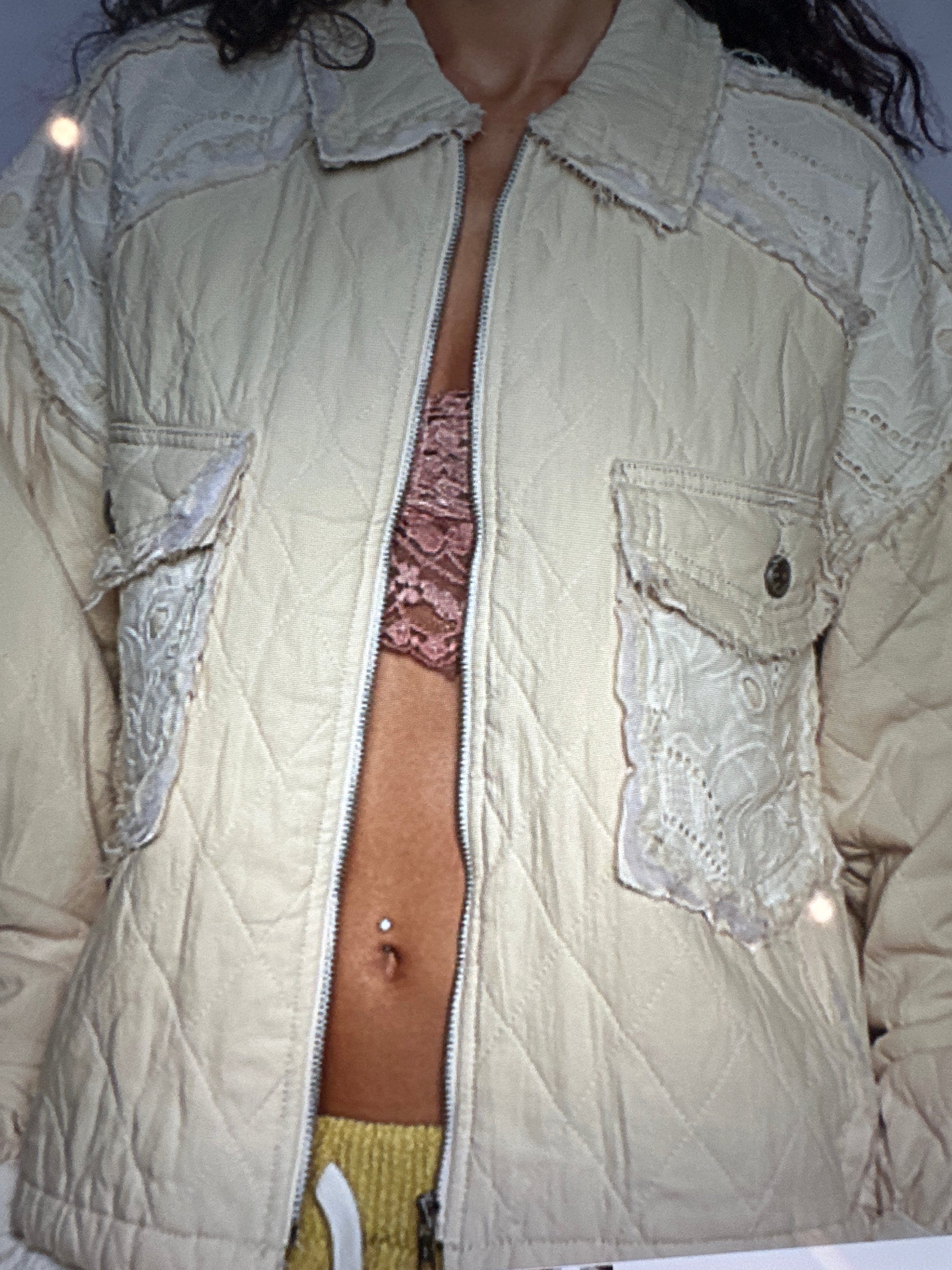Cozy meets feminine in this cream quilted jacket, detailed with delicate lace accents and frayed edges for a touch of laid-back romance. Featuring oversized flap pockets, a zip front, and a relaxed fit, it’s the perfect layer to throw over anything from loungewear to a flirty dress. Lightweight yet full of personality, this piece is a boho wardrobe essential.