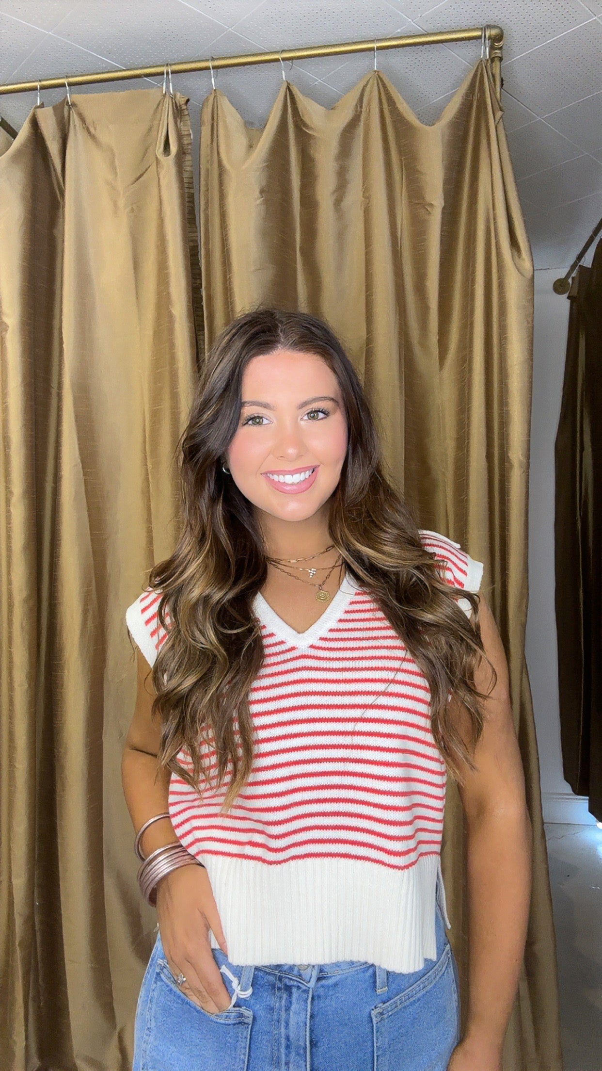 This boxy crop sweater in red stripe is tooo cute. It’s sleeveless and has a collar. It’s a sweater material that’s very breathable.