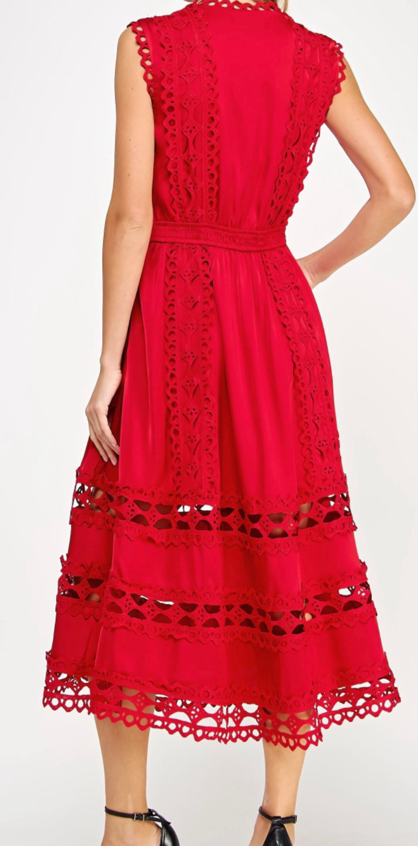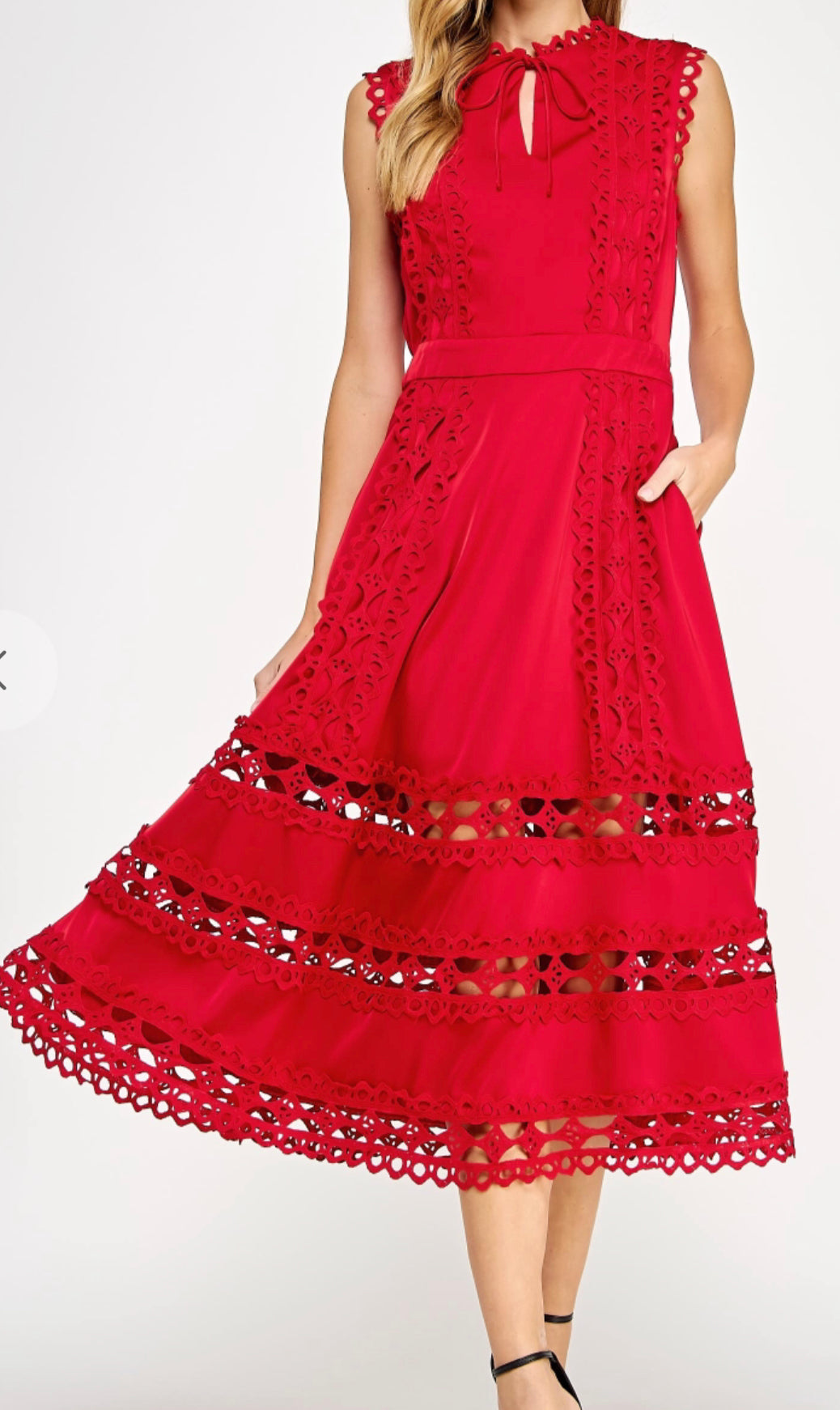 Scalloped edge crochet lace trim long dress in satin fabric. This sleeveless dress features a split V neck with tie detail, scallop crochet lace trim throughout, lining, side pockets, cinched elasticated waist at back, and A-line midi skirt.