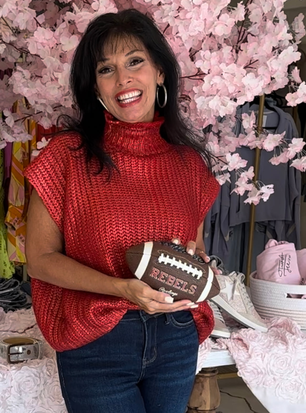 This is a beautiful metallic red sweater with drop shoulder and mock neck.