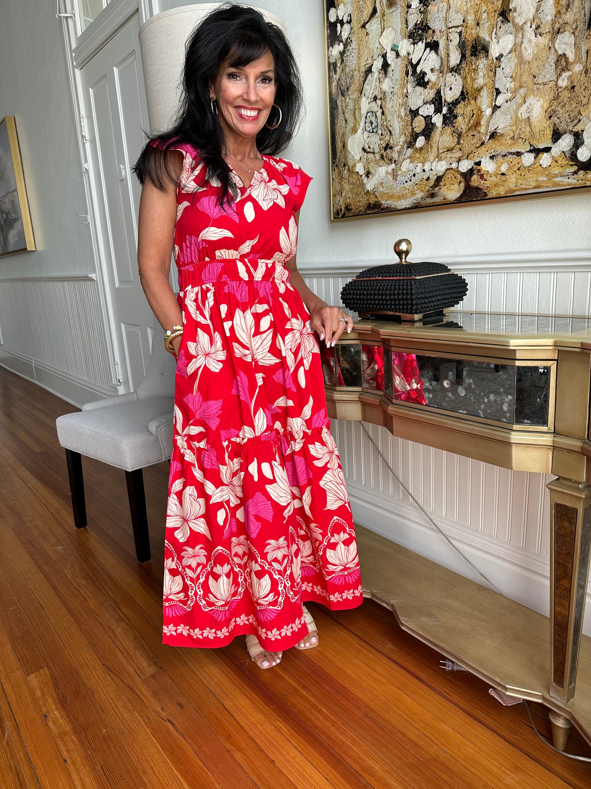 This dress is absolutely adorable with our pink and red colors and the cute ruffle sleeve. The elastic waist is very slimming. The maxi length is perfect.