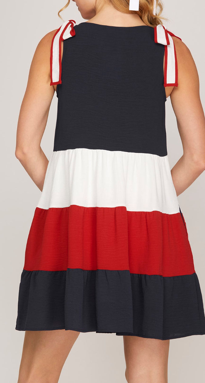 SLEEVELESS SHOULDER BOW TIE V NECK WOVEN TIERED COLOR BLOCK MINI DRESS WITH POCKETS AND SKIRT LINING