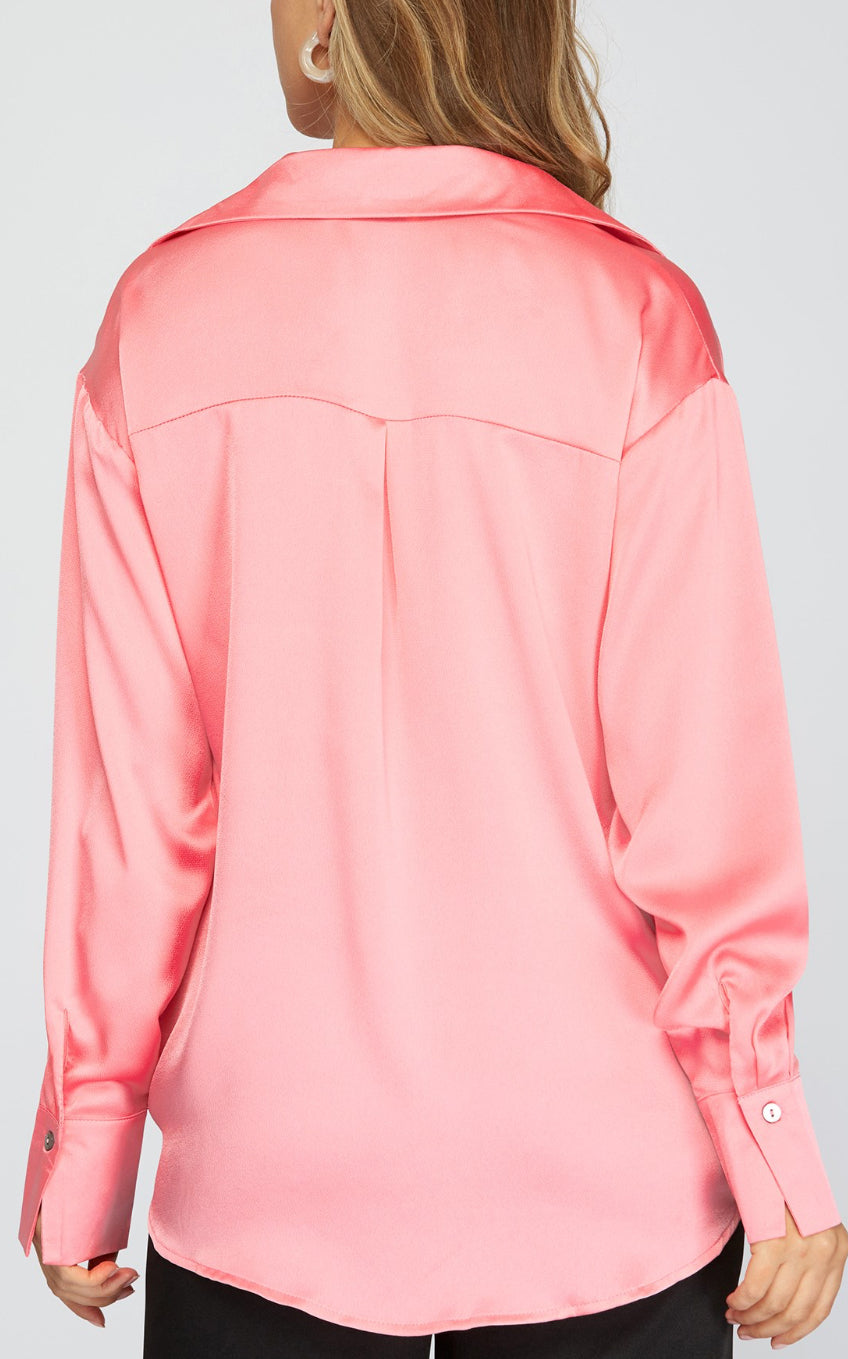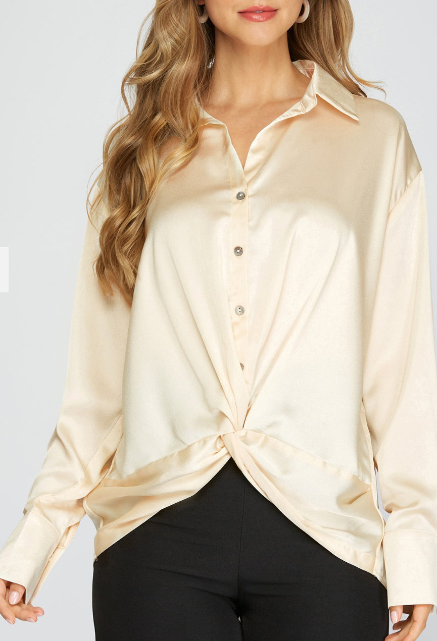 This TWISTED BUTTON DOWN SATIN SHIRT is so classic and the colors are beautiful. Perfect for the office and on to dinner.
