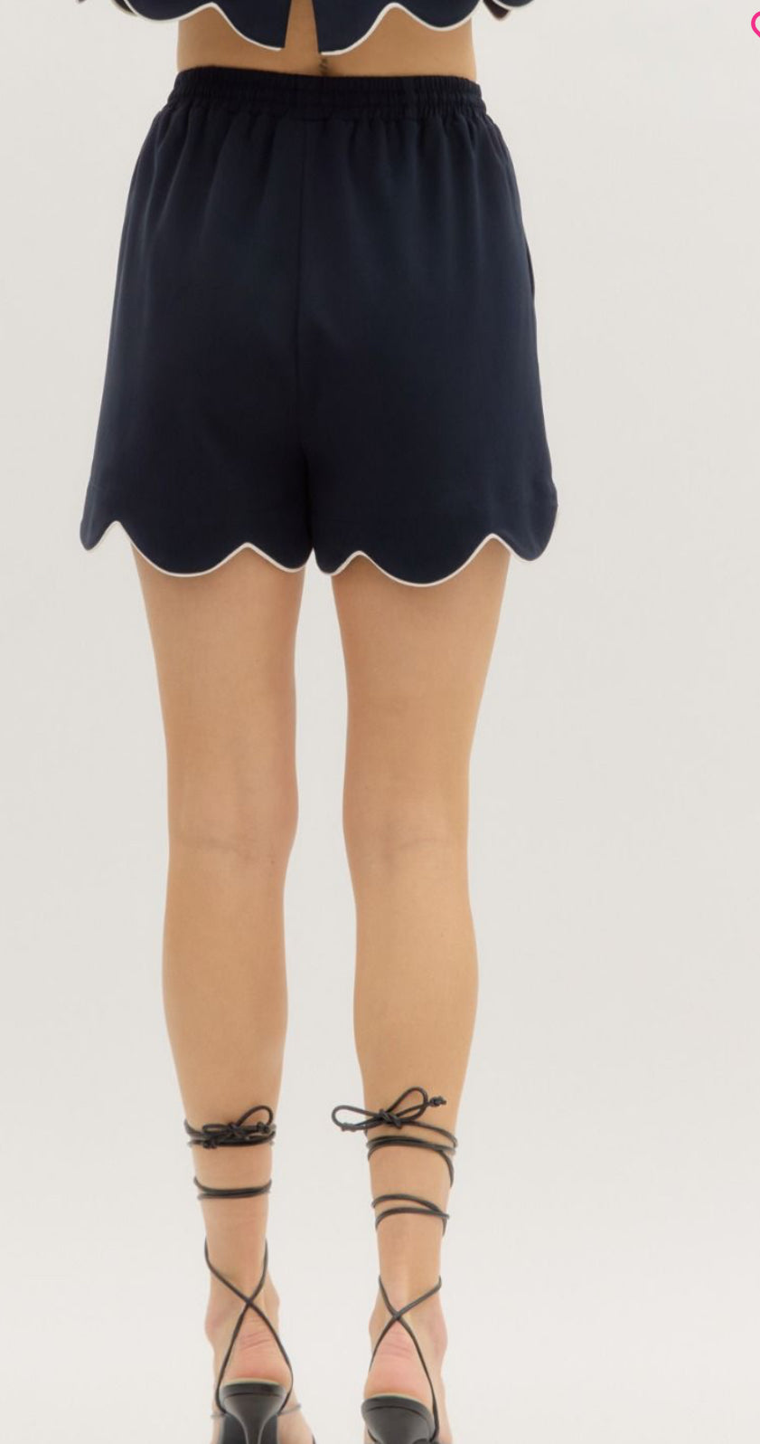 Solid high waist contrast accented scallop hem pull-on shorts. Adjustable drawstring elasticated waistband. Pockets at sides. Lined. Woven. Non-sheer