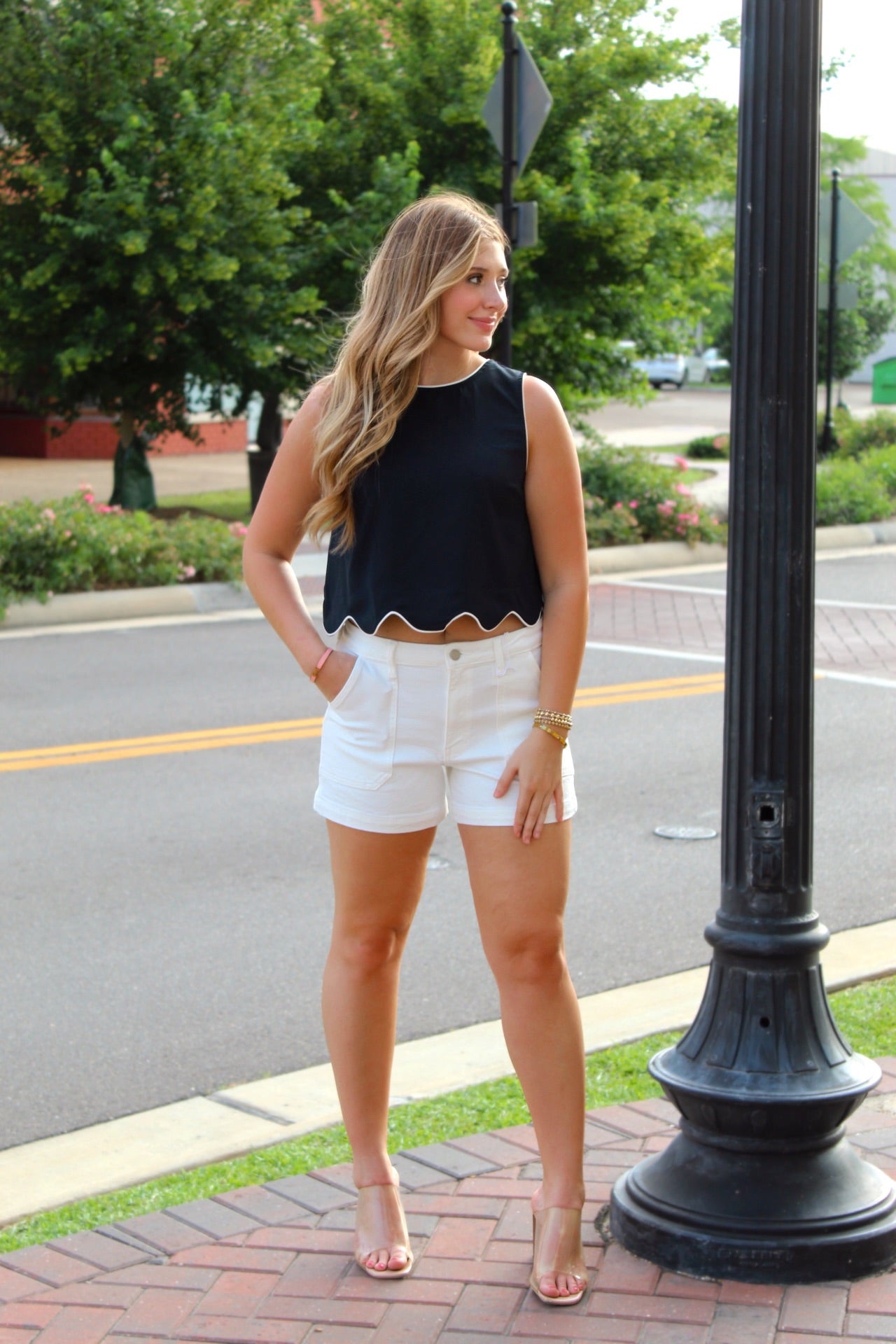 Solid sleeveless contrast accented scallop hem top featuring accented button closure at back. Unlined. Woven. Non-sheer. Lightweight.