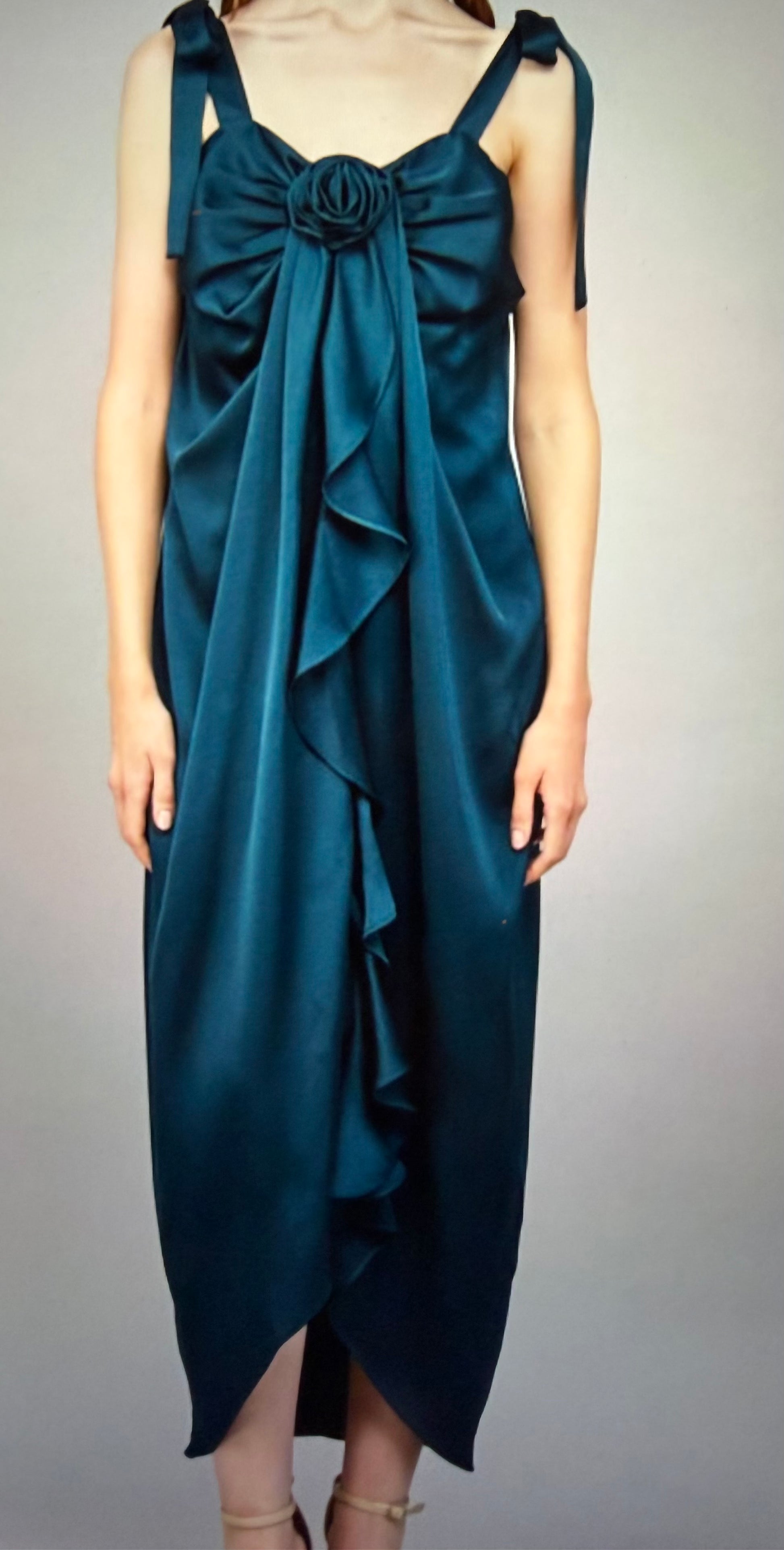 Command attention in the Romance Ruffle Dress, a breathtaking piece that blends romance with runway flair. Crafted from silky, fluid fabric in a deep teal hue, this dress cascades beautifully with a front ruffle that flows into a soft, asymmetrical hem. The rosette detail at the bodice adds a touch of couture charm, while the delicate tie straps allow for a customizable fit. Whether you’re attending a winter wedding, an evening soirée, or a candlelit dinner, this dress promises to make every moment feel unforgettable.