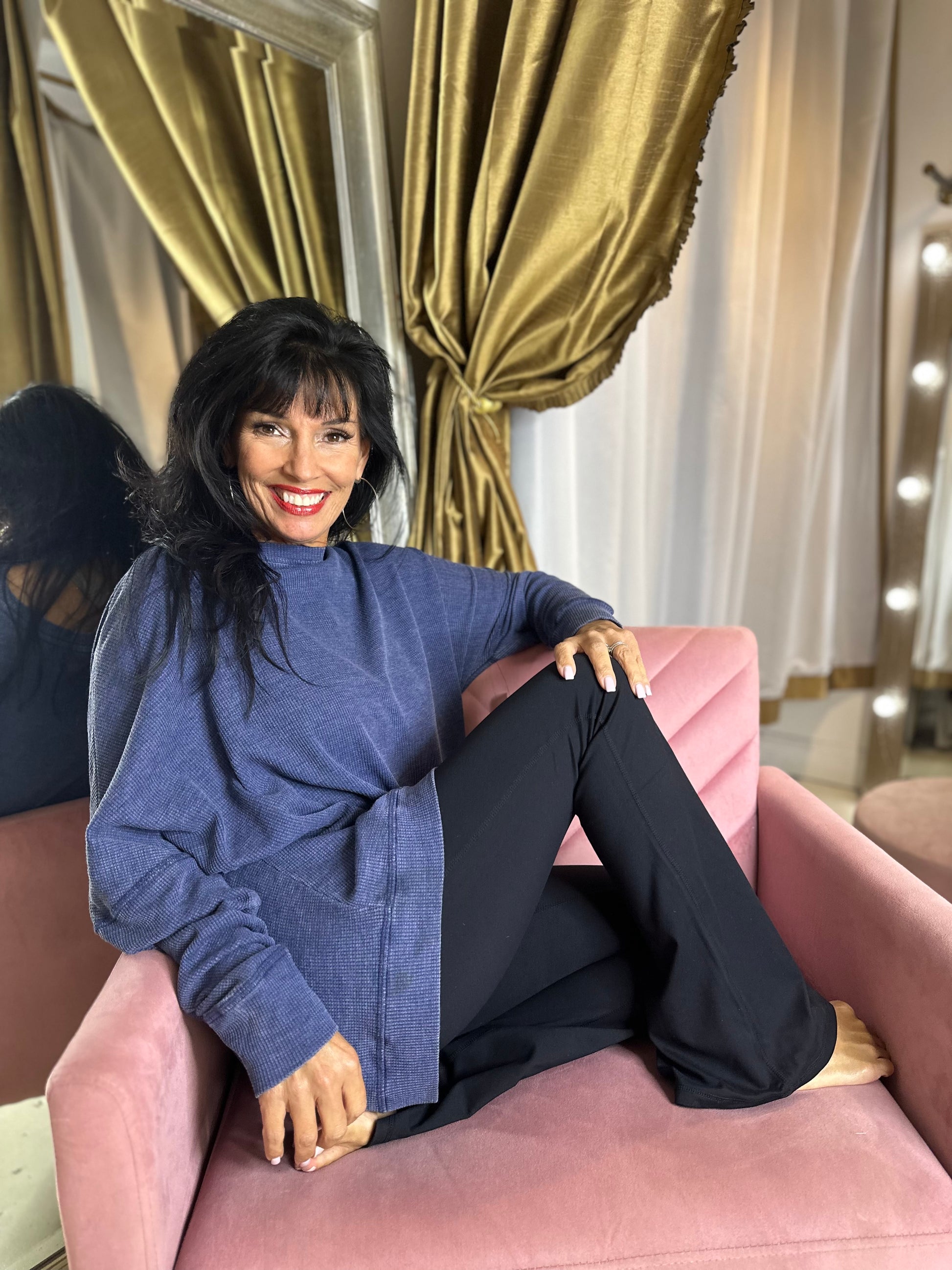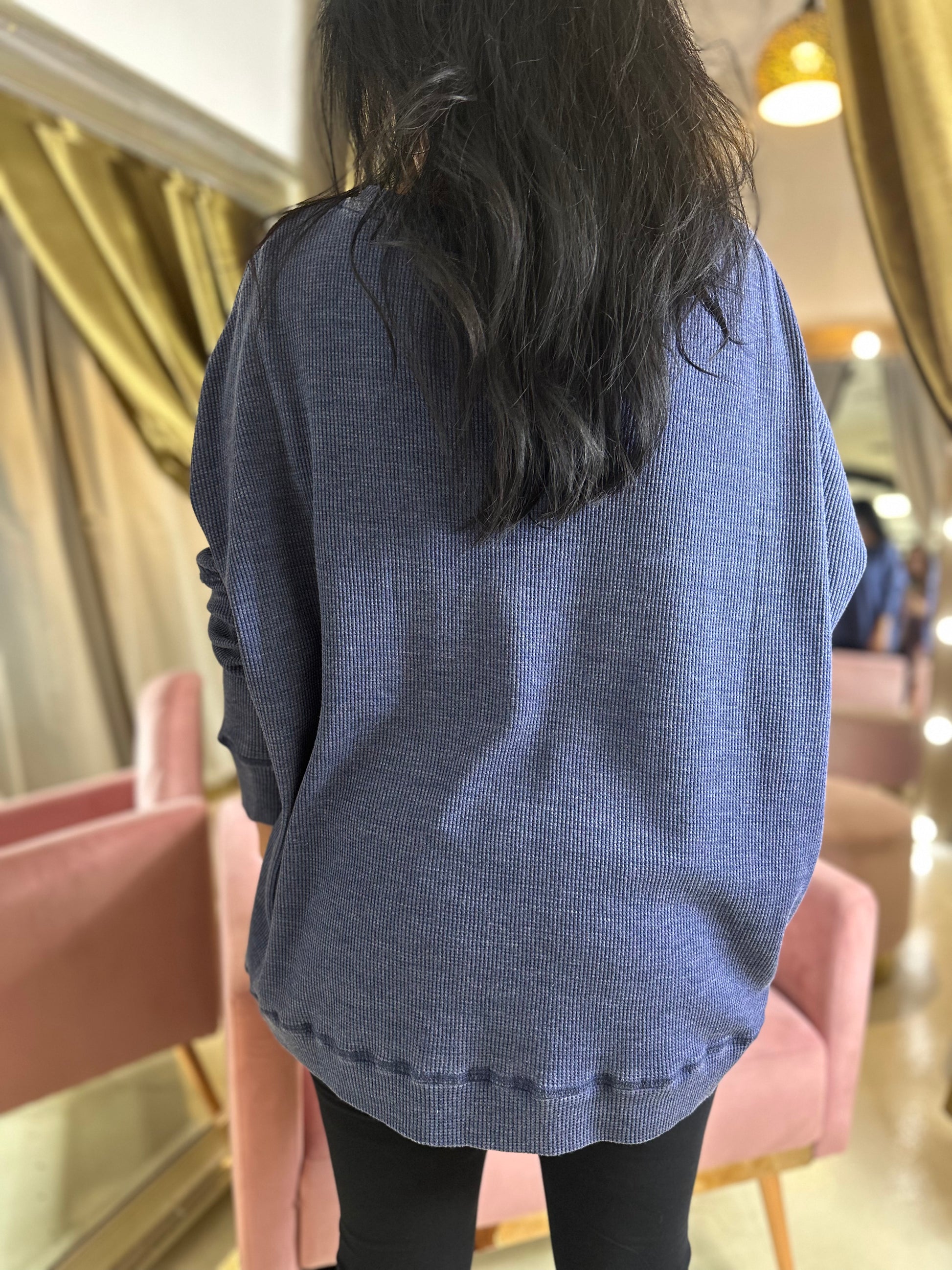 These tops are so very comfortable and oversized. The are perfect with leggings and come in black and navy. They have long sleeves and a round neck in a waffle knit.