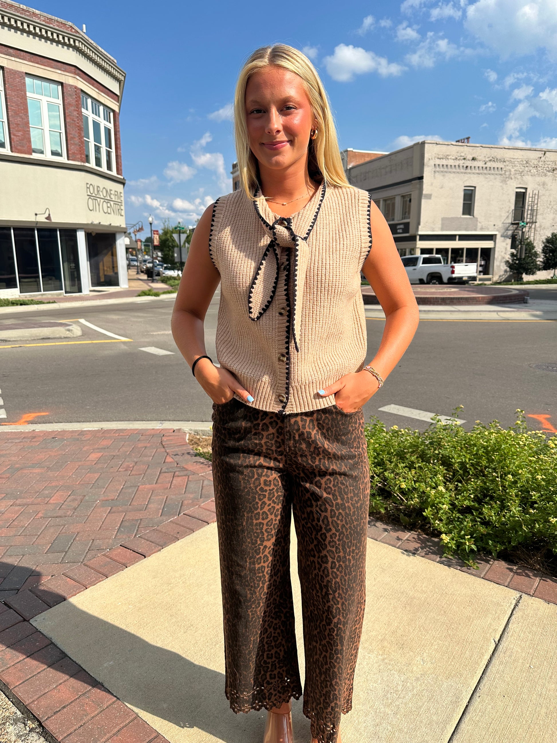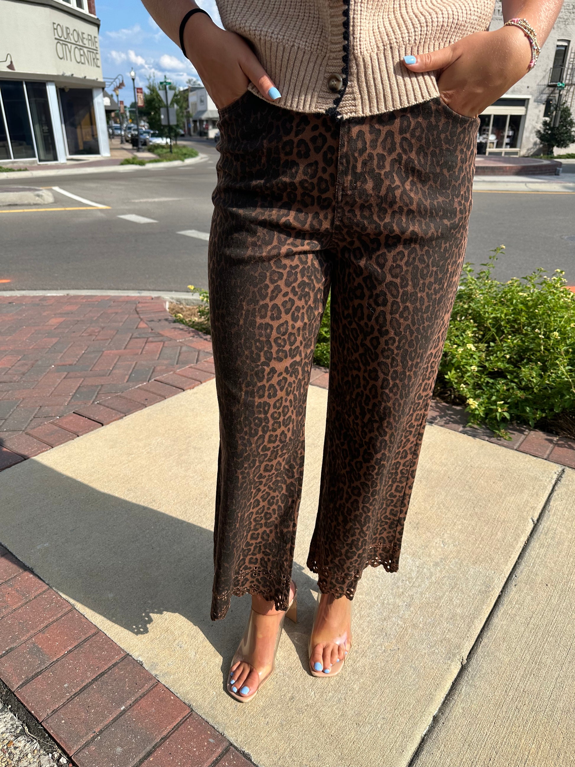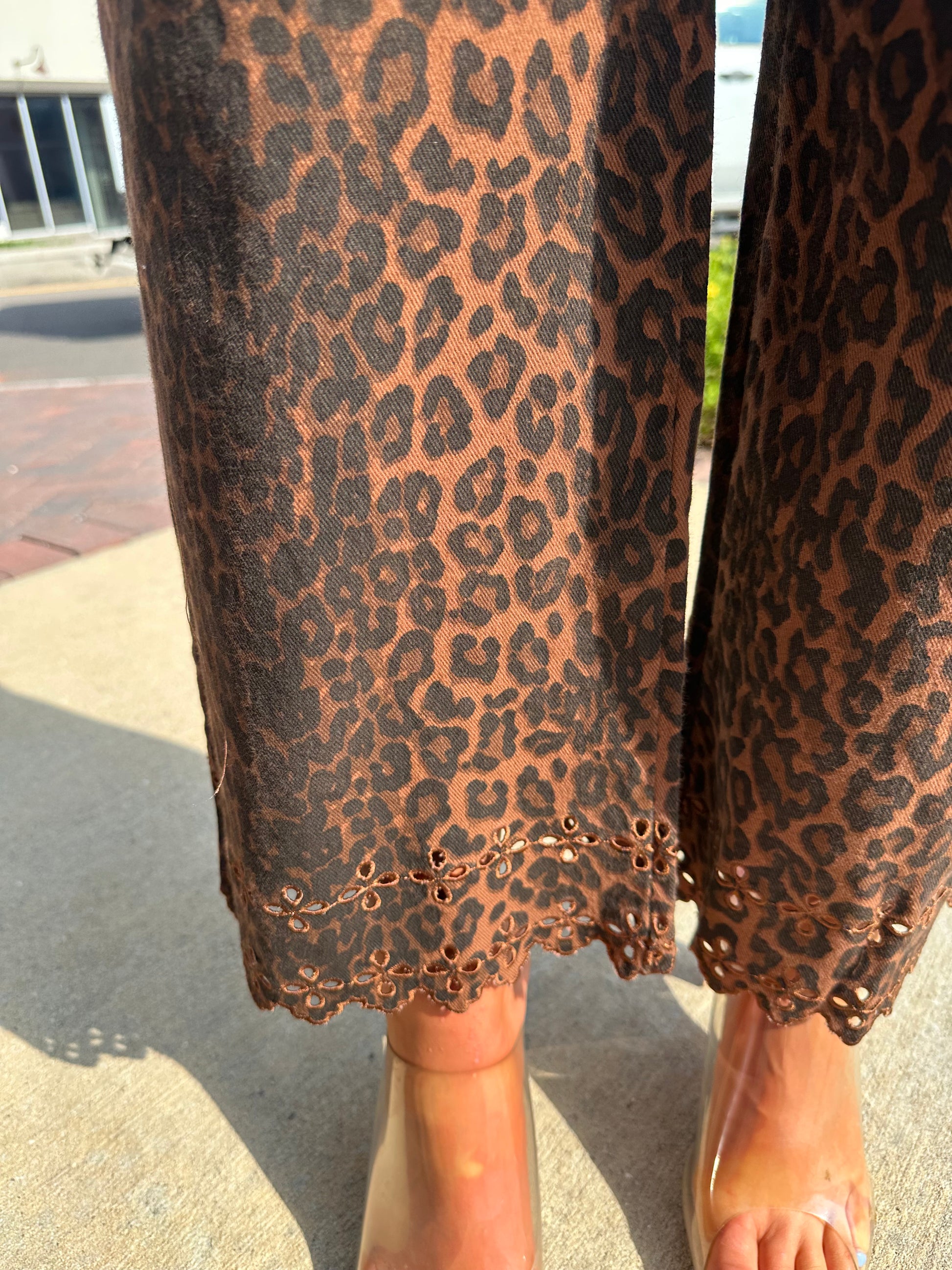 These lightweight jeans feature a stylish leopard print in rich brown tones, making them a bold addition to any outfit. The relaxed, wide-leg fit ensures comfort while allowing for easy movement, perfect for casual or dressy occasions. The delicate lace detailing at the hem adds a unique touch, elevating the overall look and giving it a chic vibe.