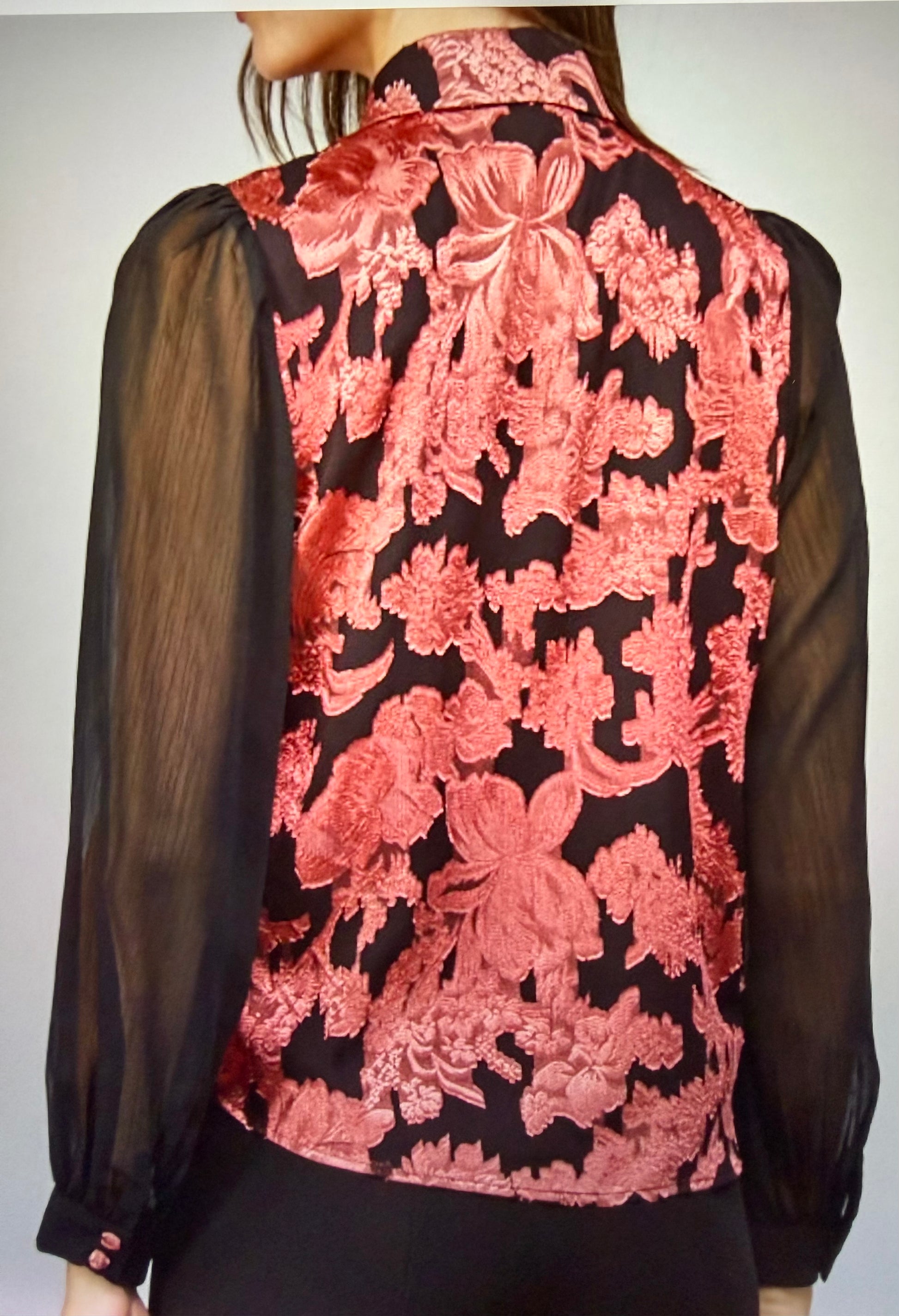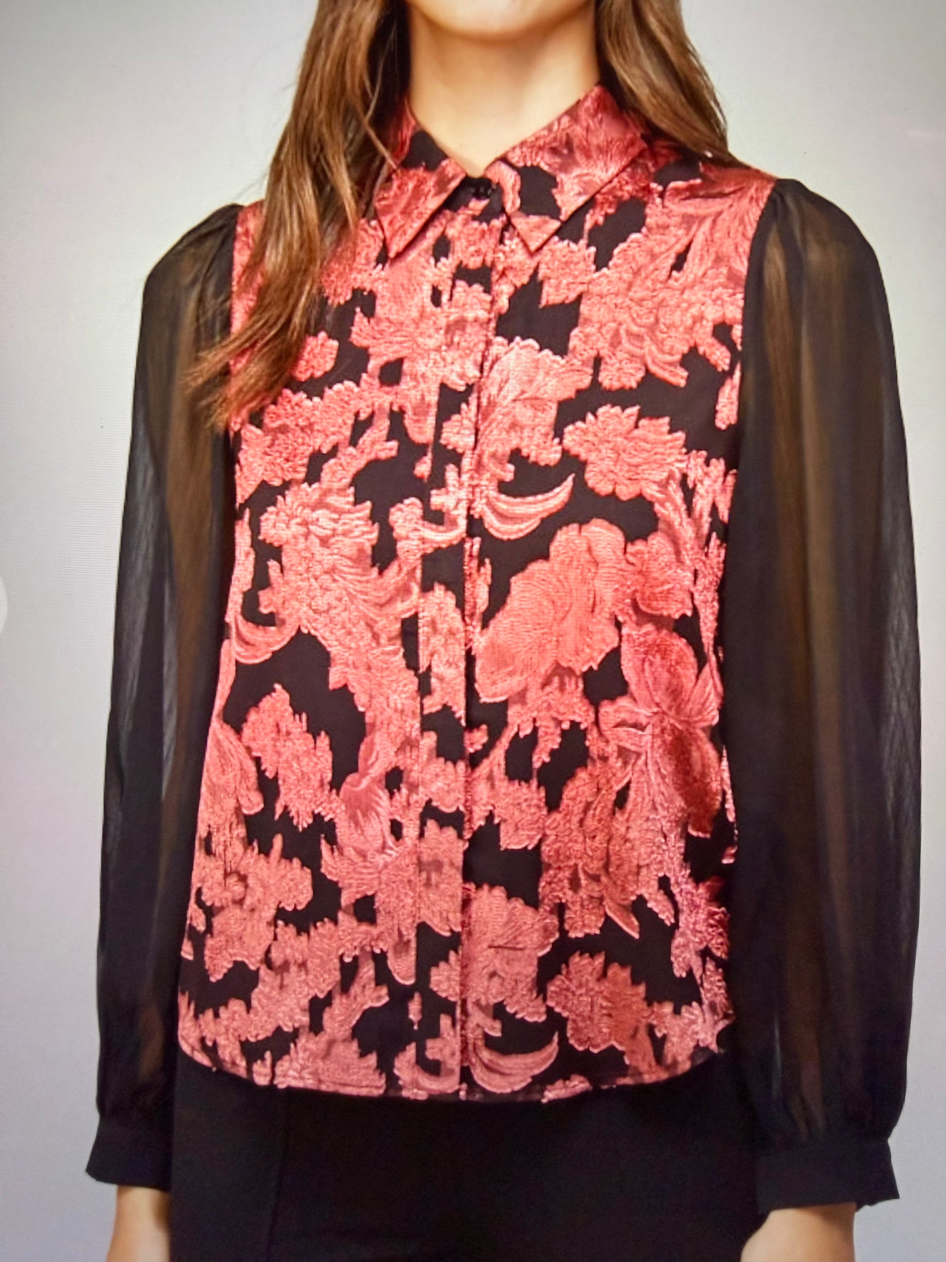 This beauty features a rich black base adorned with intricate red floral embroidery that gives a luxurious, textured finish. The sheer black chiffon sleeves add a touch of mystery and elegance, while the button-down front and crisp collar keep it timeless and chic. Pair it with sleek trousers or a pencil skirt for an effortlessly sophisticated look that transitions from desk to dinner with ease.