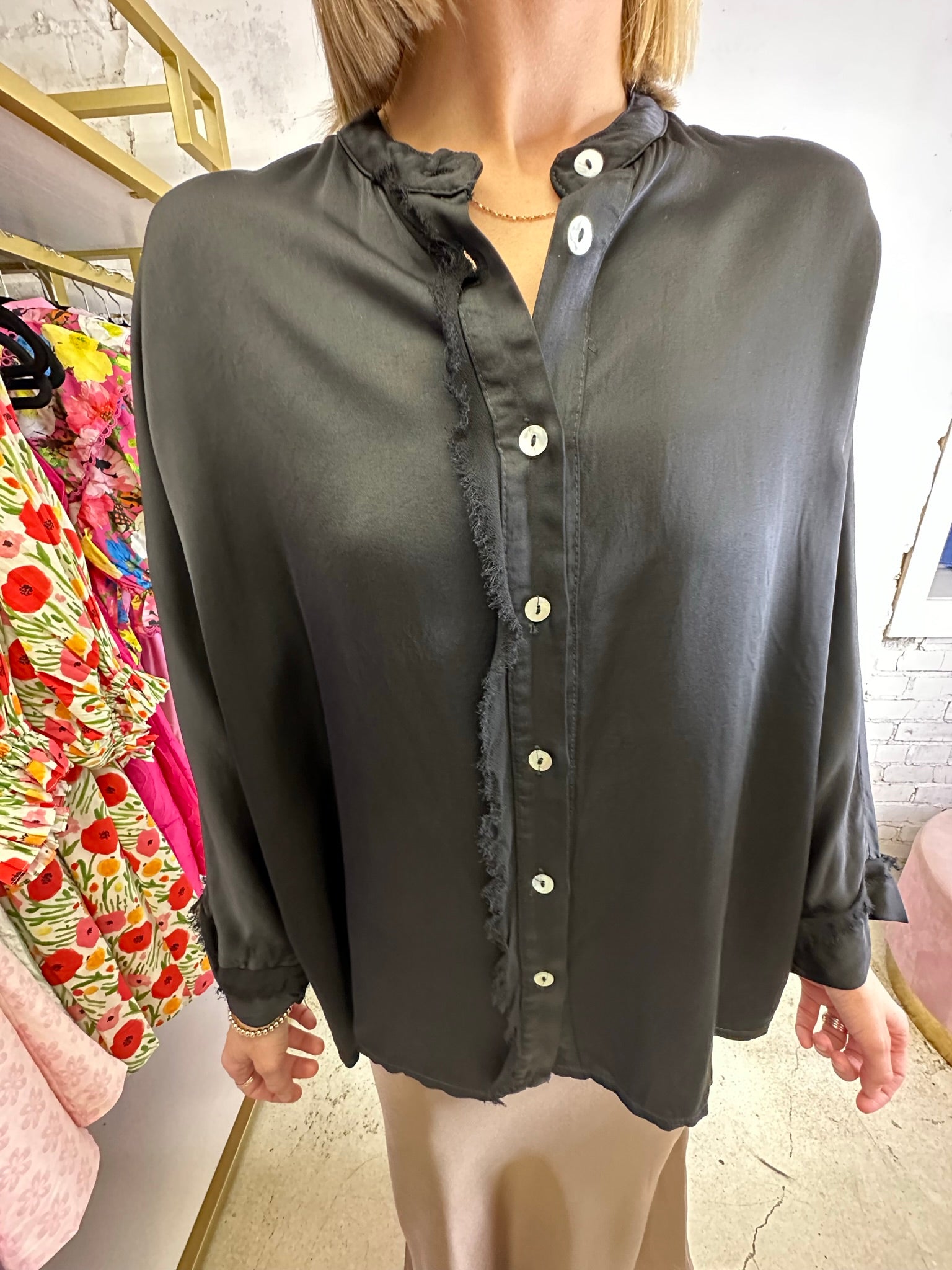 This is a gorgeous silk button down with a freyed trim down the front. It has shell buttons and long sleeves.