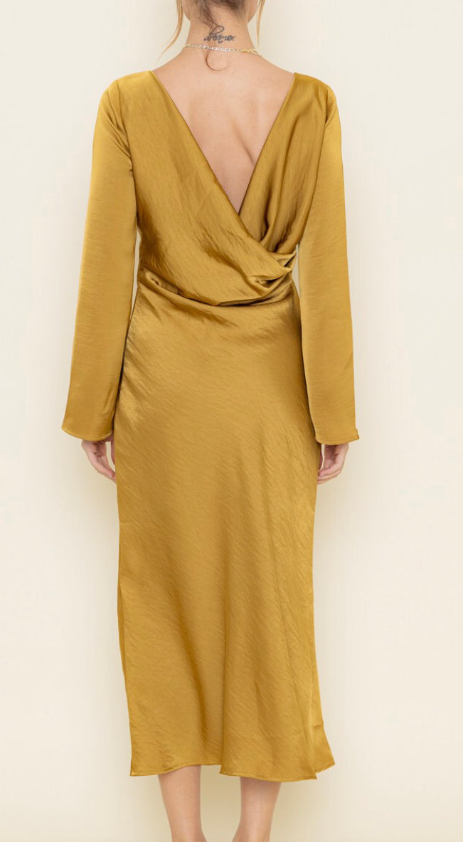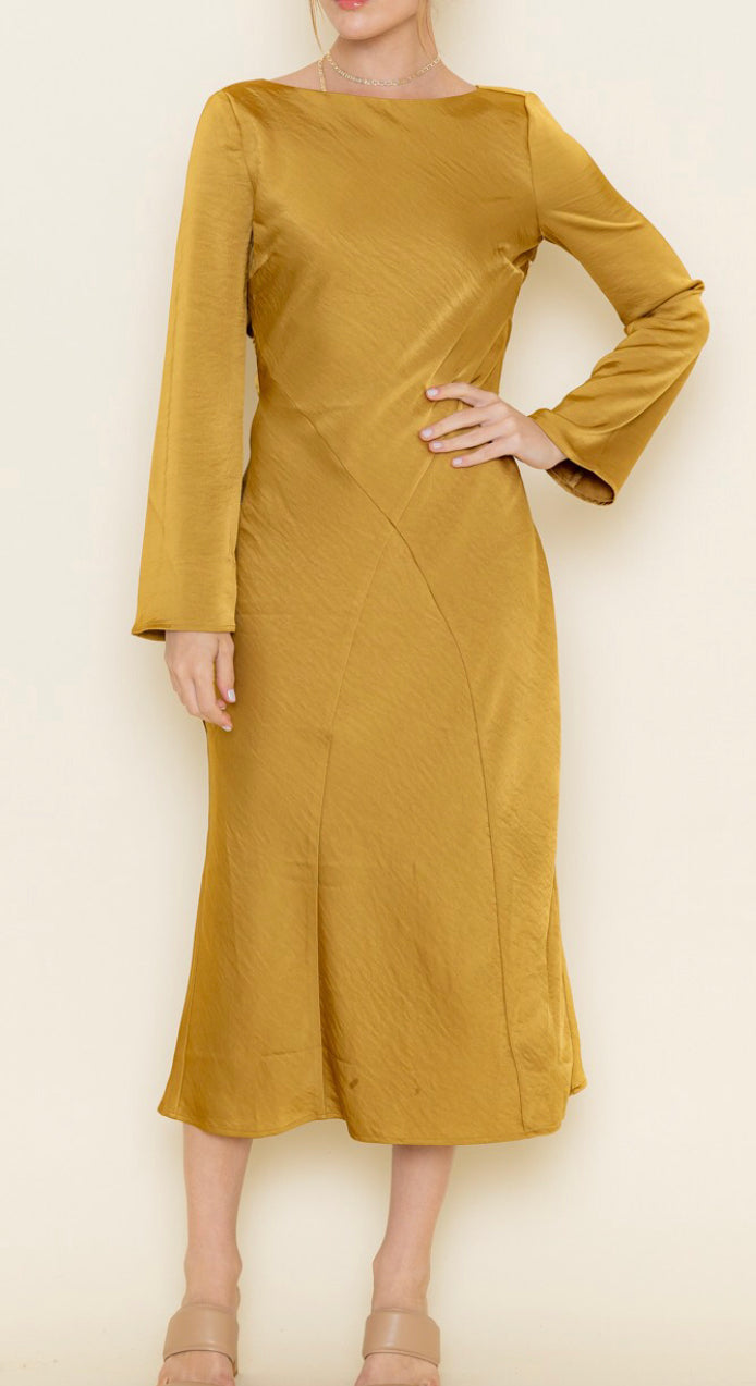 This elegant midi-length dress features a sophisticated cowl back design that adds a touch of drama to its classic silhouette. It has long sleeves and a flattering round neck, with a drop waist that creates a graceful, flowing shape. -BACK COWL LONG DRESS -MIDI LENGTH -LONG SLEEVE -ROUND NECK -COWL BACK -DROP WAIST