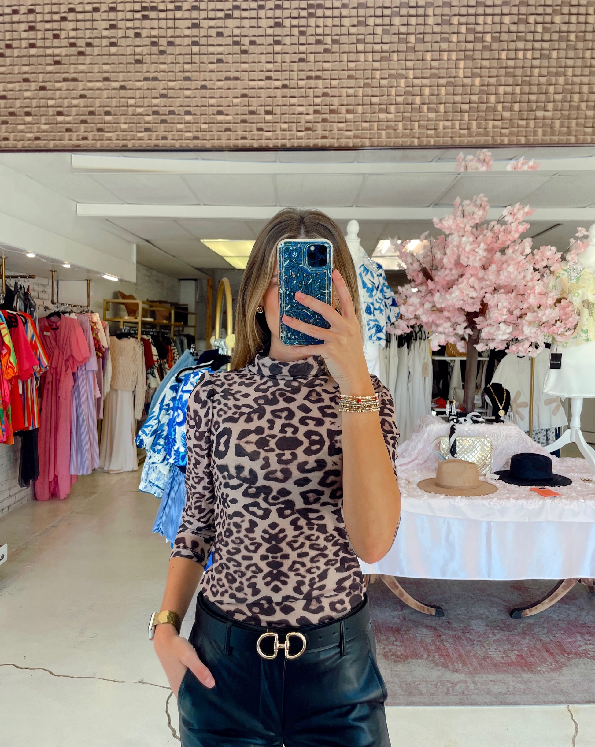 The top features a trendy leopard print design in earthy tones of beige and dark brown. It has a relaxed fit with long sleeves and a stylish cowl neckline, adding an element of sophistication. The soft fabric ensures comfort, making it perfect for both casual outings and layered looks. This versatile piece can be paired with jeans, skirts, or leggings for a chic, animal-inspired ensemble.