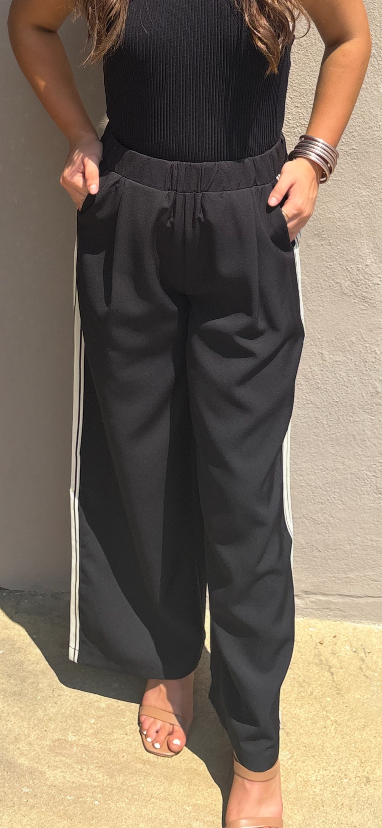 These sleek black wide-leg pants are all about effortless style with a sporty twist. Featuring bold ivory double side stripes, an easy pull-on elastic waistband, and a flowy silhouette, they’re perfect for pairing with sneakers for a casual vibe or heels for an elevated athleisure look. Comfort meets cool in every step.