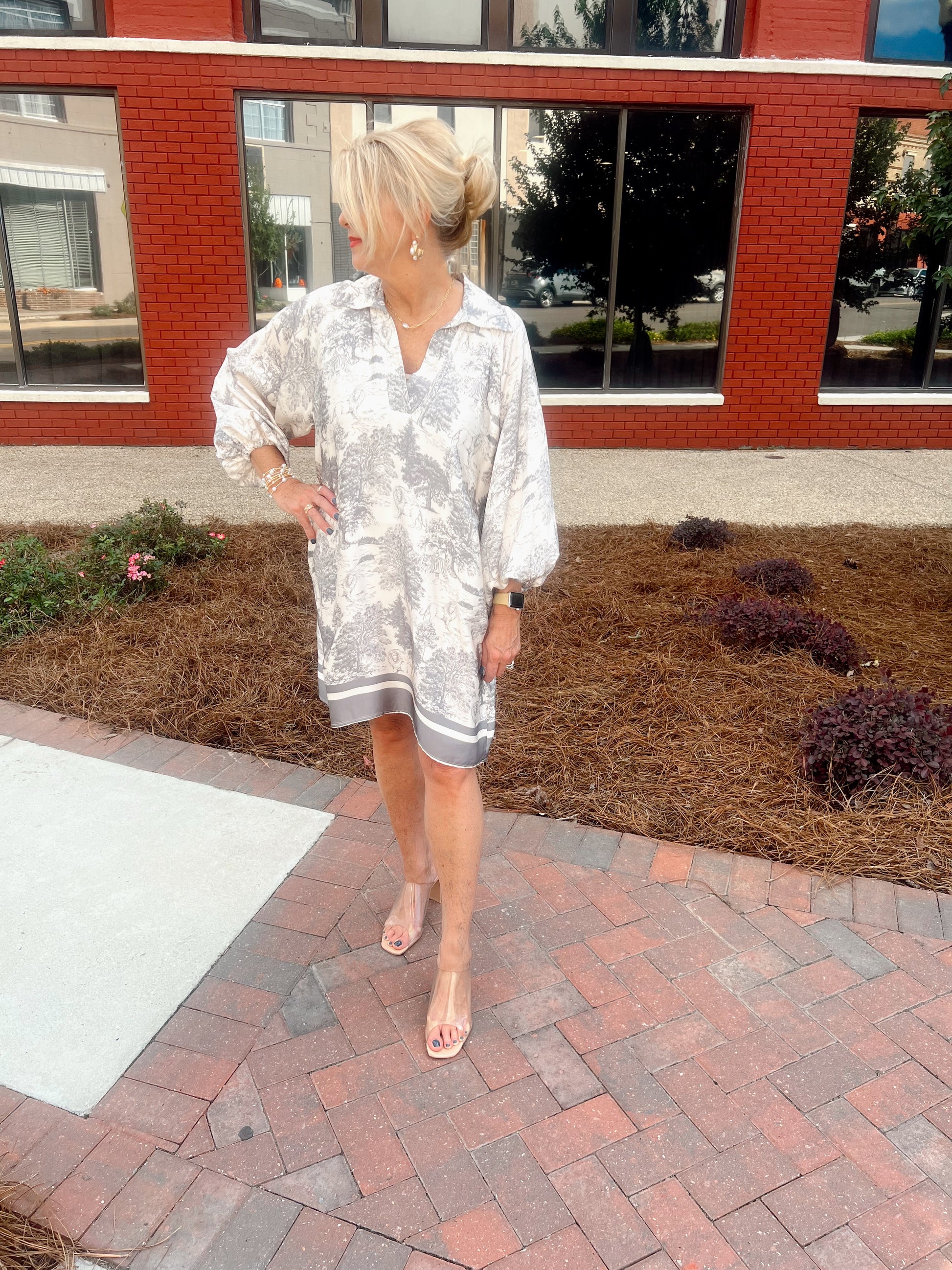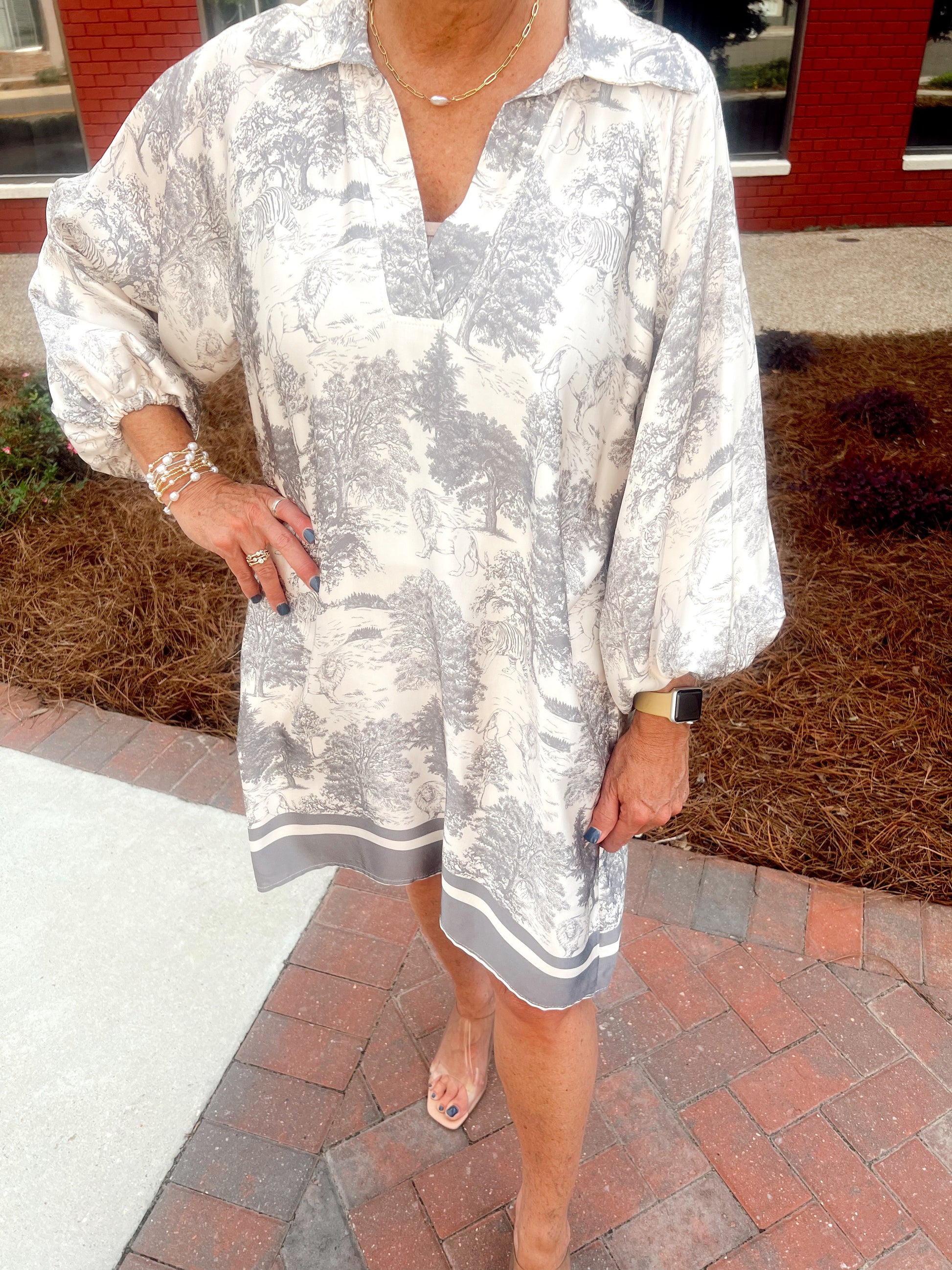 Beautiful sheath dress in a cream silk with silver toile print. It has a v neck with a collar. Absolutely gorgeous, classic style.