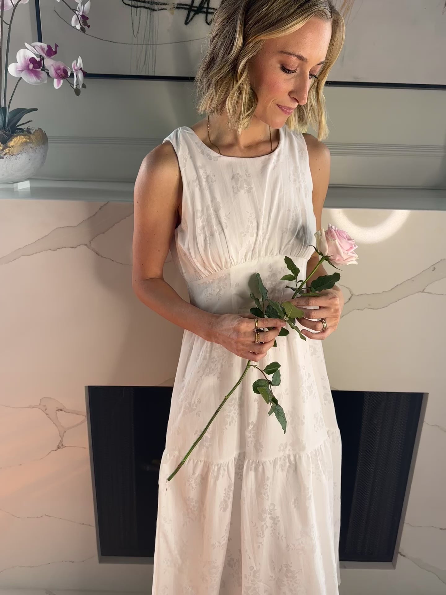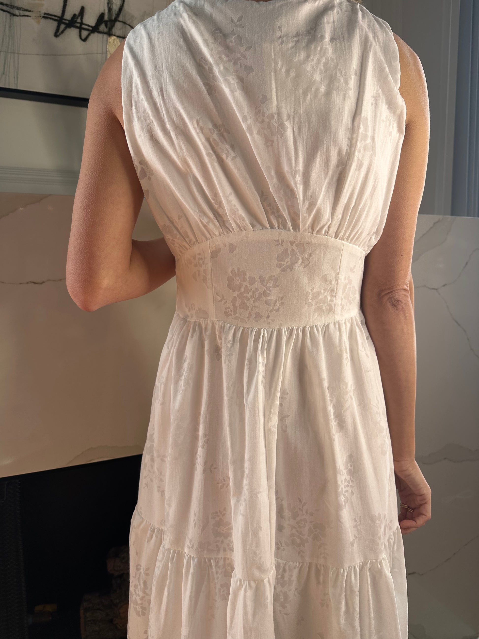 This is a white on white floral print material from 50% Polyester 50% cotton dress is absolutely gorgeous. The long maxi is a sleeveless dress with a fitted waist that is very flattering. It zips up the back.