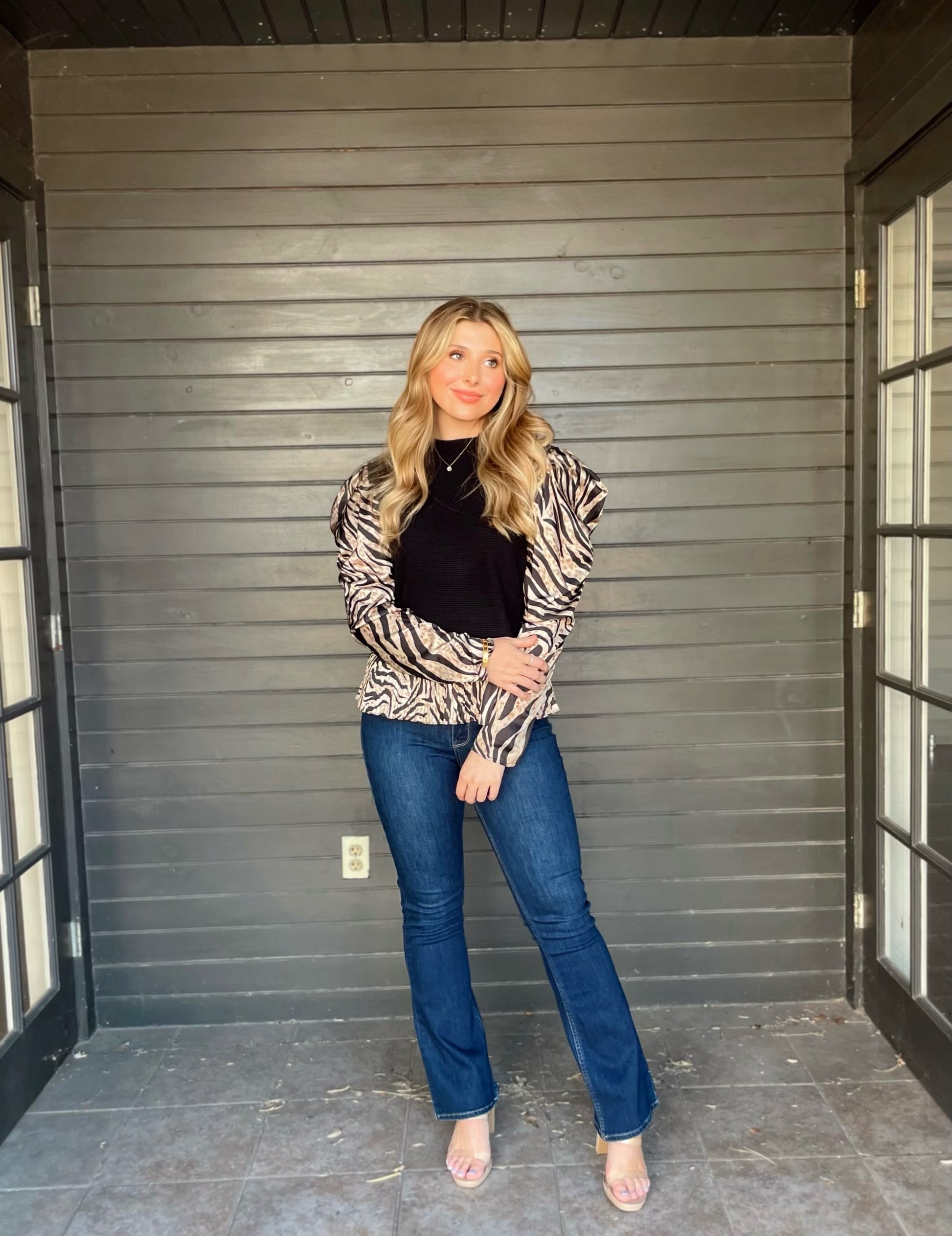 This sweater top combines a classic black foundation with striking zebra-print sleeves, creating a bold and fashionable contrast. The fitted black body offers a sleek silhouette, while the voluminous sleeves add a playful touch. The mix of textures and patterns makes it an eye-catching piece, perfect for casual outings or dressing up for special occasions.