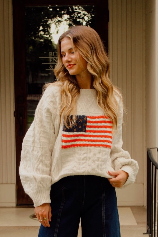 Show your patriotic spirit in cozy style with this cream cable knit sweater featuring a bold American flag detail across the front. The chunky knit texture and classic crew neckline make it a timeless piece you’ll love to wear for holiday weekends, cool nights, or any day you want to add a touch of Americana charm. Perfect with denim shorts, white jeans, or layered over a collared shirt for a preppy-chic look.