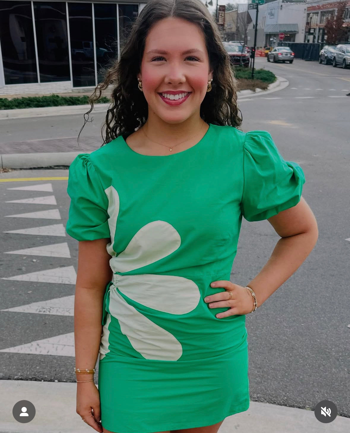 This mini dress has a side cut out flower in a cotton poplin fabric.It has a round neck with stirred shoulders and a feminine patchwork flower detail.