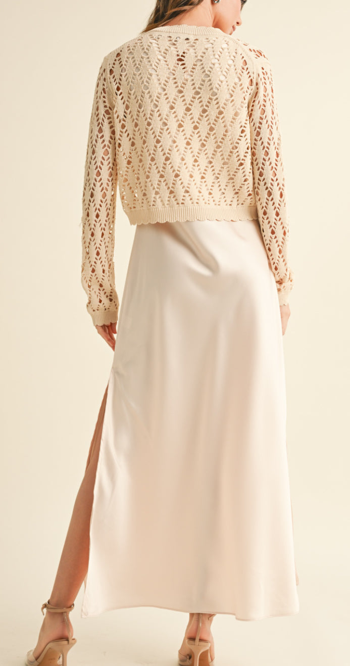 SATIN SLIP DRESS WITH CROCHET KNITTED TOP.This is a beautiful combination of satin and crochet. So very feminine.