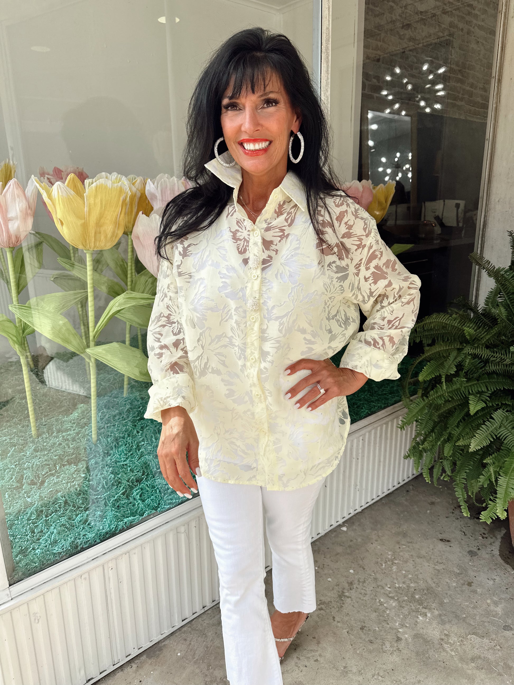 ✨ Soft, sheer, and simply stunning. This lemon-hued blouse is giving floral elegance with a pop of pearl buttons and rhinestones throughout 💛 Perfect for dressing up or standing out. #TwoATeeStyle #DressedToATee