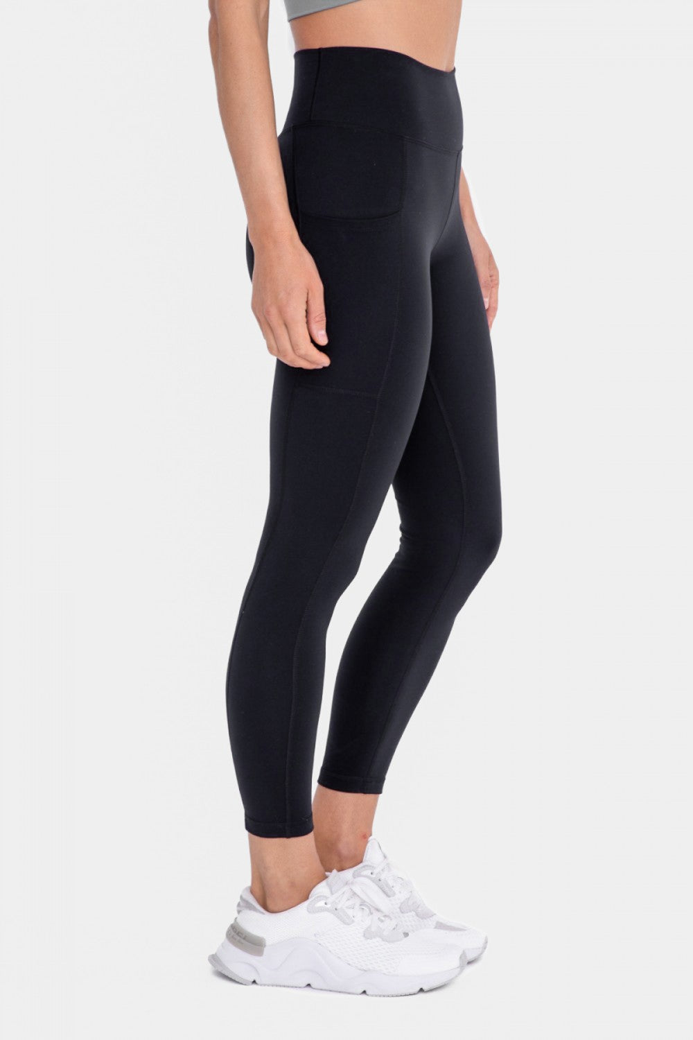 This pair of performance-level leggings was constructed using a four-way stretch, solid-colored nylon-Lycra-blend fabric. It comes with deep pockets on each side and a sweetheart-shaped back to accentuate your figure.