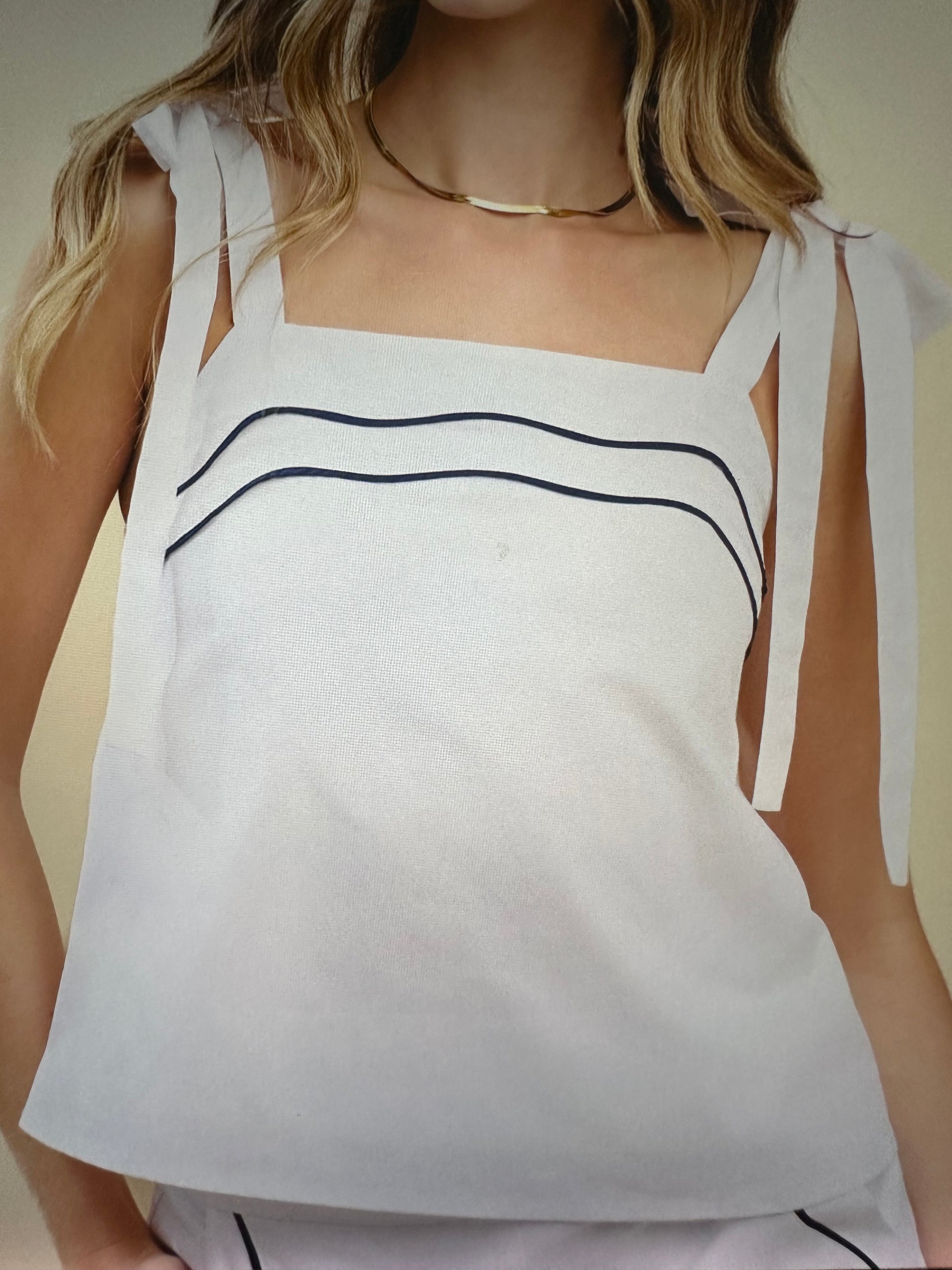 This is a fresh and modern piece that effortlessly combines elegance with a touch of playfulness. This lightweight top features a square neckline and delicate tie straps that add a unique flair. The subtle contrast piping across the bodice creates a sophisticated outline, enhancing its minimalist charm.
