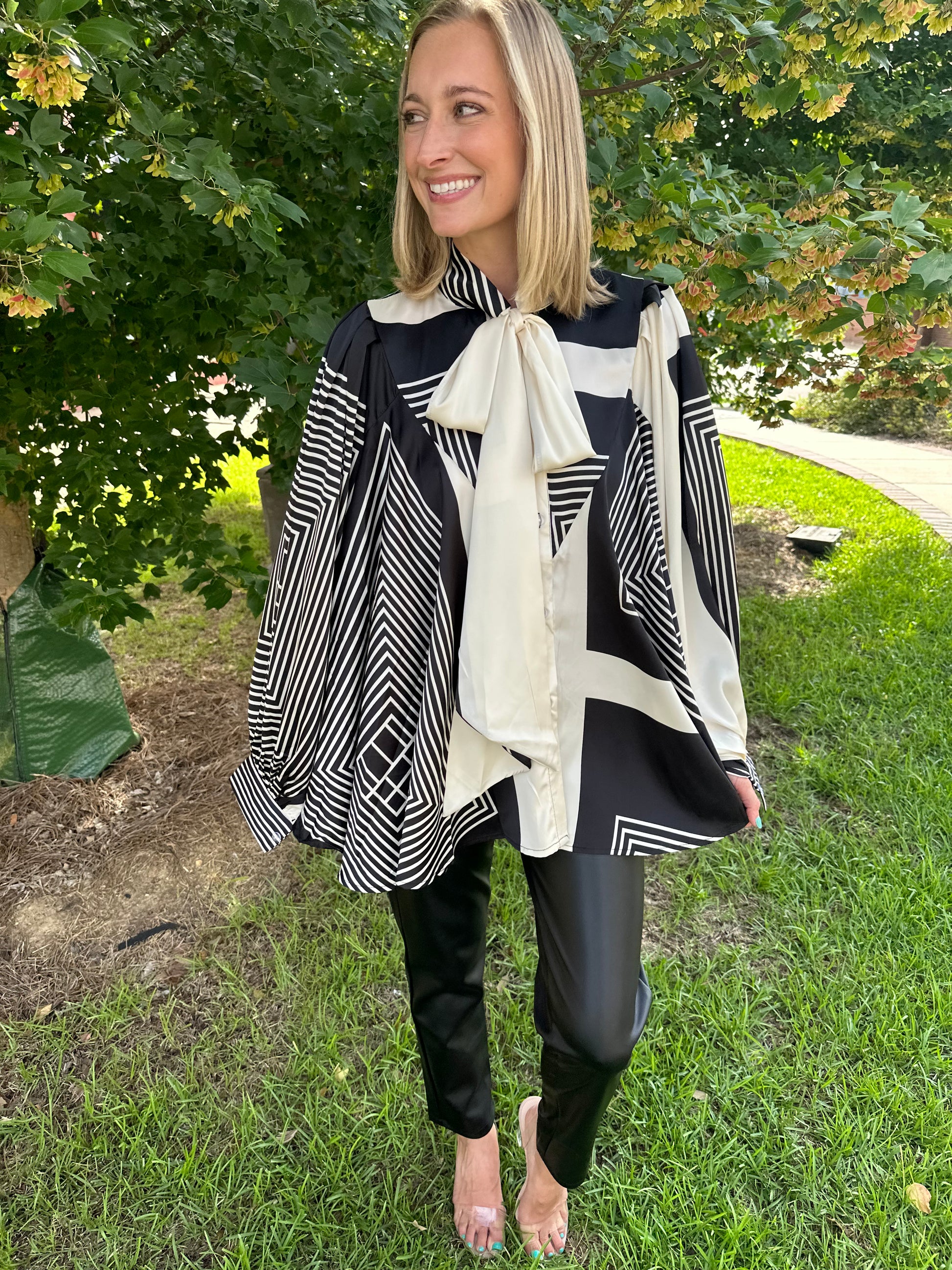 Step into sophistication with this striking black and ivory geometric-print blouse. Designed with bold contrast patterns and voluminous pleated sleeves, this top is all about making a statement. The oversized satin bow at the neckline adds a playful yet polished touch, perfect for dressing up denim or pairing with sleek trousers. Flowy, fashion-forward, and full of flair—this piece is a head-turner from boardroom to brunch.