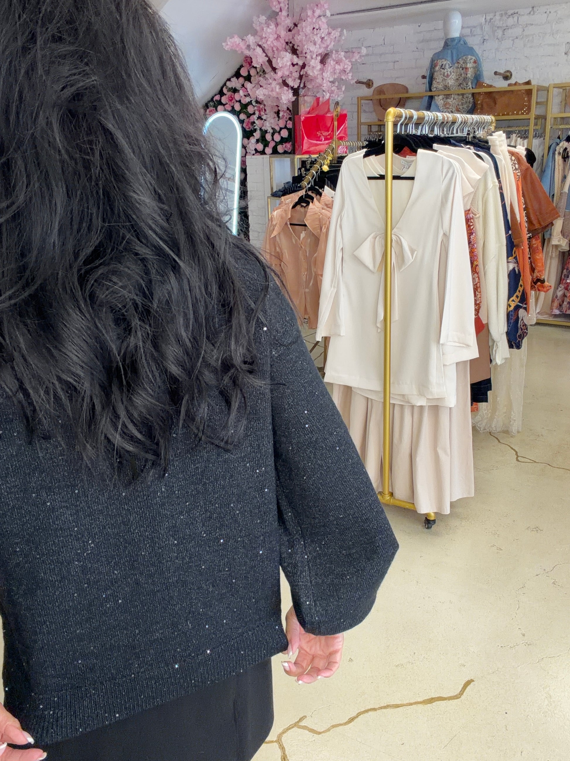 Sweet meets chic in our Tied Up in Sparkle Sweater! This cozy charcoal knit is sprinkled with subtle shimmer for just the right amount of glam. The three crystal-trimmed bow ties add a feminine twist, while the relaxed fit keeps it comfy and easy to style.