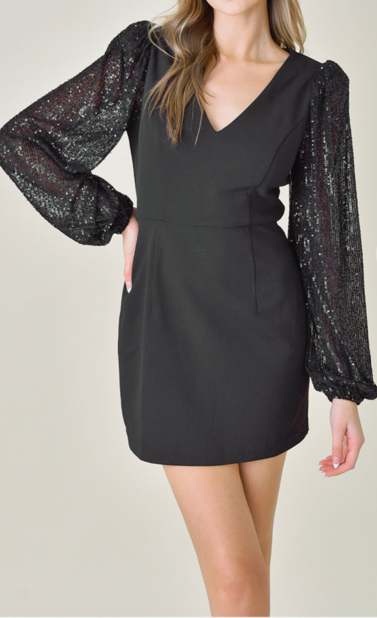 This is a gorgeous black dress with these sequin sleeves that make a beautiful timeless statement of elegance yet simplistic style.