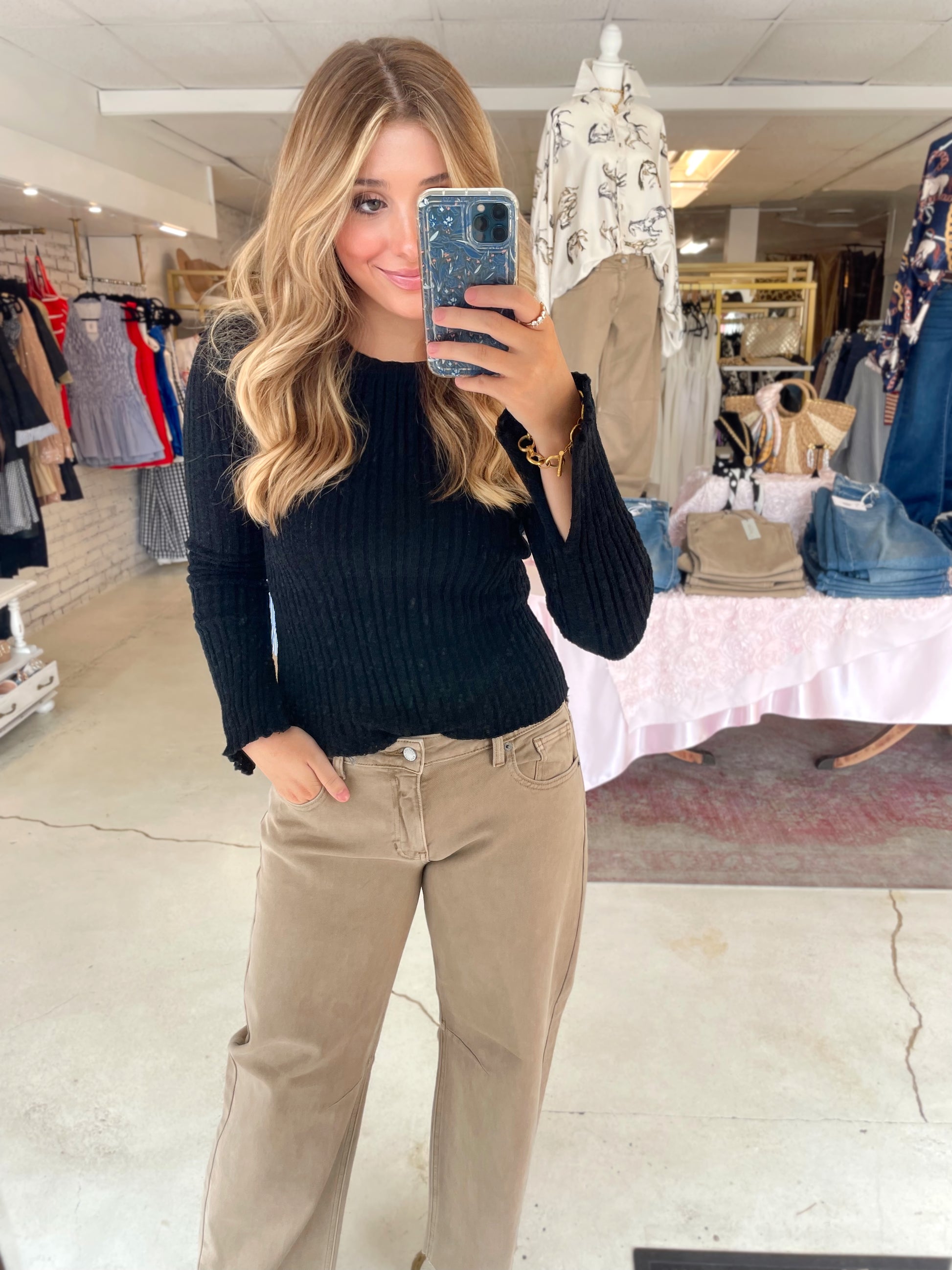 The sweater in the image features a classic ribbed design, which adds texture and dimension. It's black in color, making it versatile for various outfits. The long sleeves and crew neckline contribute to its cozy and timeless look. The bottom hem appears to have a slightly cropped style, giving it a modern touch. Overall, this sweater seems perfect for layering or wearing on its own during cooler weather.